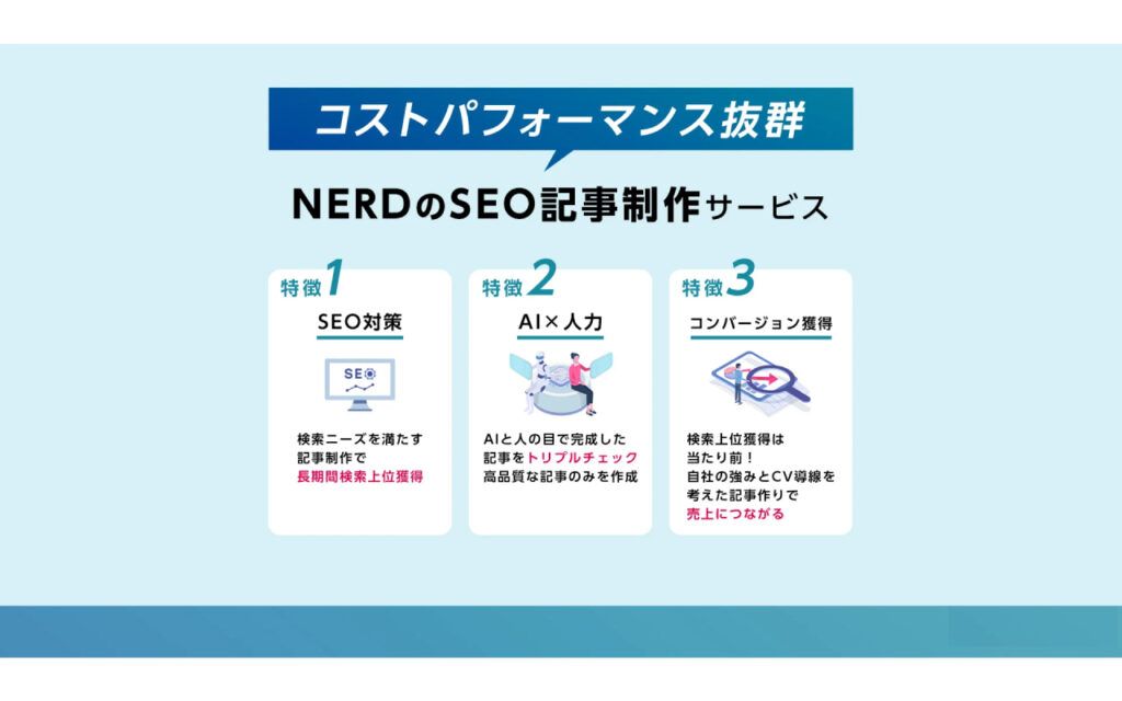 NERD(ナード)株式会社(本社: 東京都墨田区、以下「NERD」)は、この度、これまでクライアント企業向けに提供していた「SEO記事制作」サービスを正式にリリースした事をお知らせします。