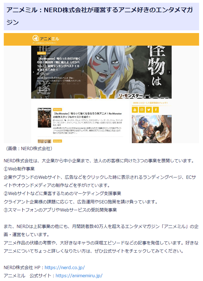 今回、株式会社メタバース総研のwebサイトにて、「おススメのWebメディア運営会社」としてNERDと、NERDが運営するアニメ好きのエンタメマガジン「アニメミル」をご紹介いただきました。