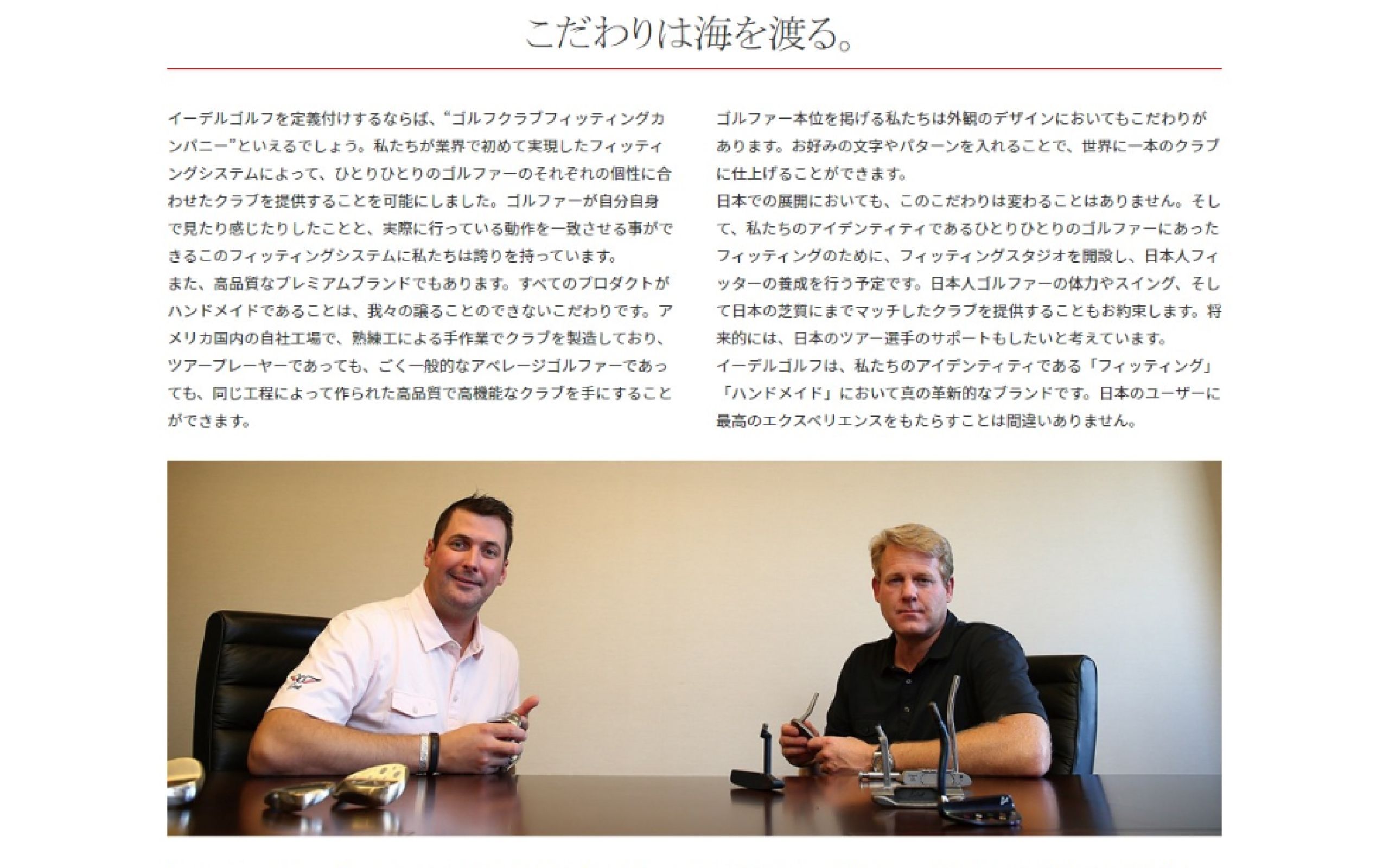 http://edelgolfjapan.com/アメリカ生まれのクラブメーカー「イーデルゴルフ」の日本版サービスサイト制作の事例です。イーデルゴルフは熟練工による最高品質のハンドメイドでゴルフ機器を製作しているブランドであり、創業以来世界中のゴルファーに愛されています。これまで他社様が管理されていたホームページを引き継いでの制作となり、より管理のしやすいサイトとなるよう調整をさせていただきました。今後も改善点含めより効果のあるサイトとなるようご提案させていただいております。