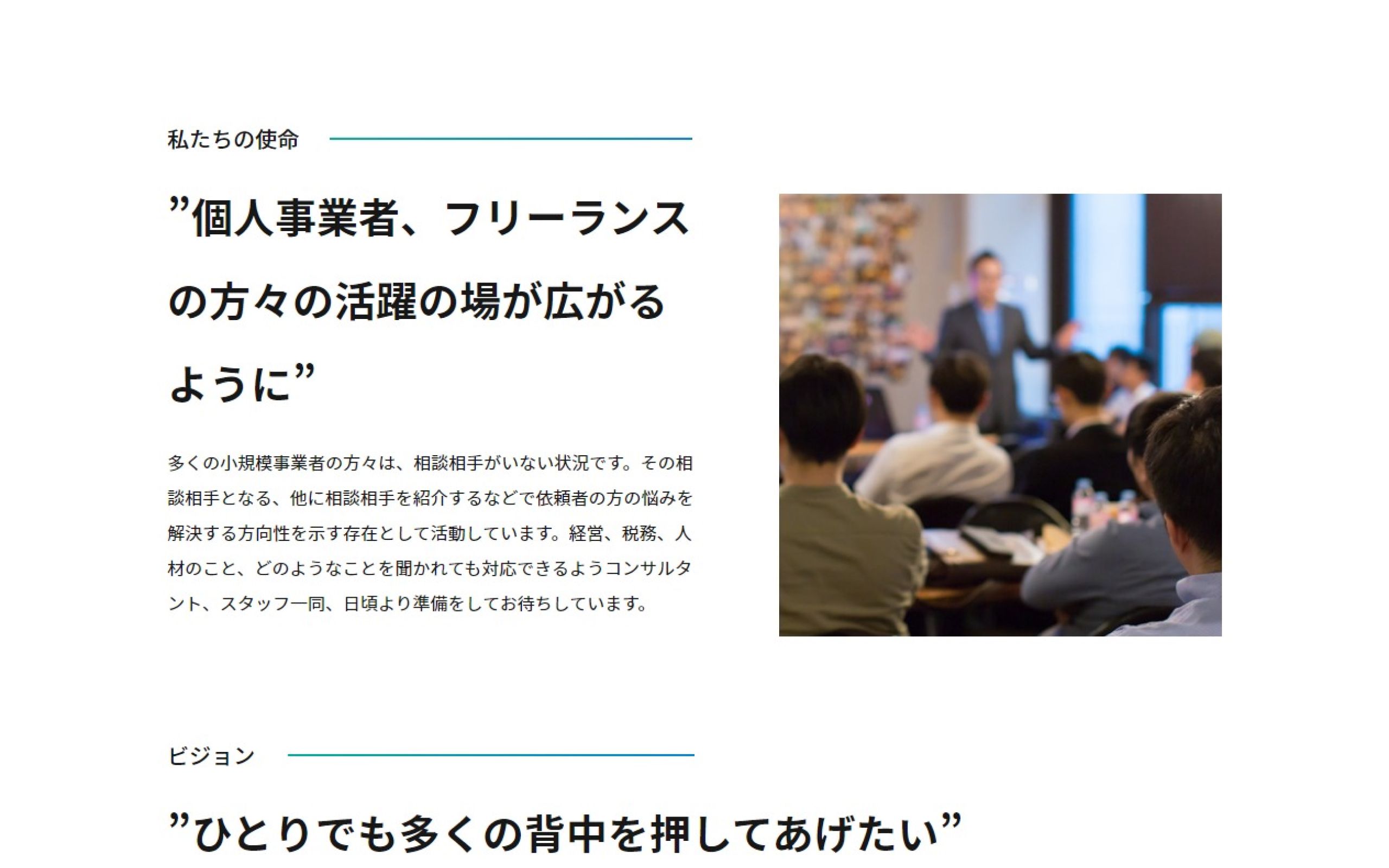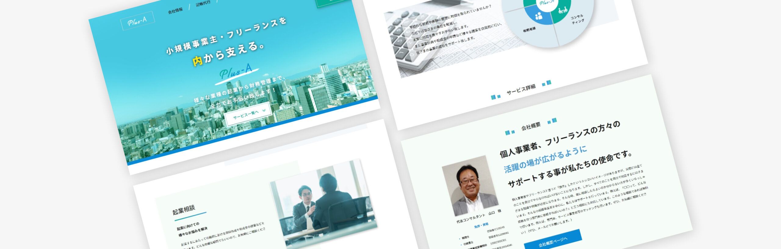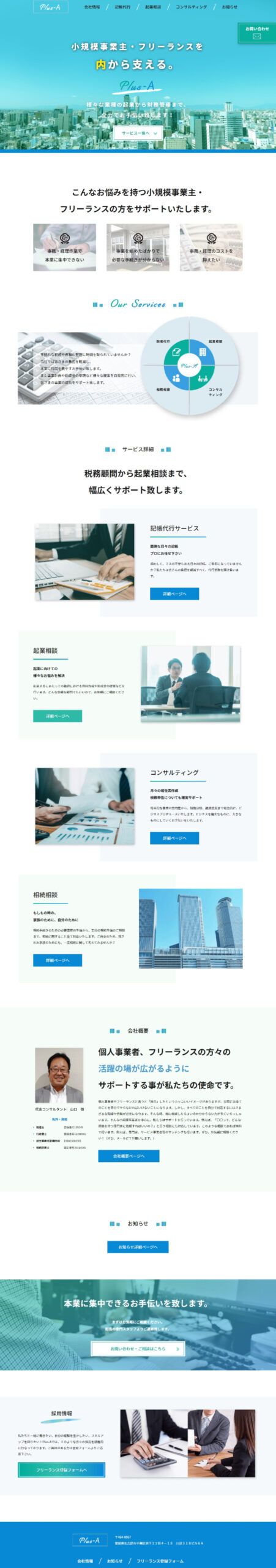 https://plusa-consult.com/小規模事業主やフリーランスの方の事務・経理作業サポートサービスを提供する「株式会社Plus-A」様のサービスサイト制作の事例です。こちらの会社では小規模事業主やフリーランスの方を対象に記帳代行など事務・経理サポートサービスを提供しているほか、独立・企業の相談やコンサルティングも行っています。元々簡単なホームページをお持ちでしたが、より事業内容がわかる新しいページが欲しいというご依頼をいただきました。税理関連のサイトですが気軽にご覧いただきやすいようなデザインに仕上げ、無事に公開に至りました。保守契約も引き続きいただいております。