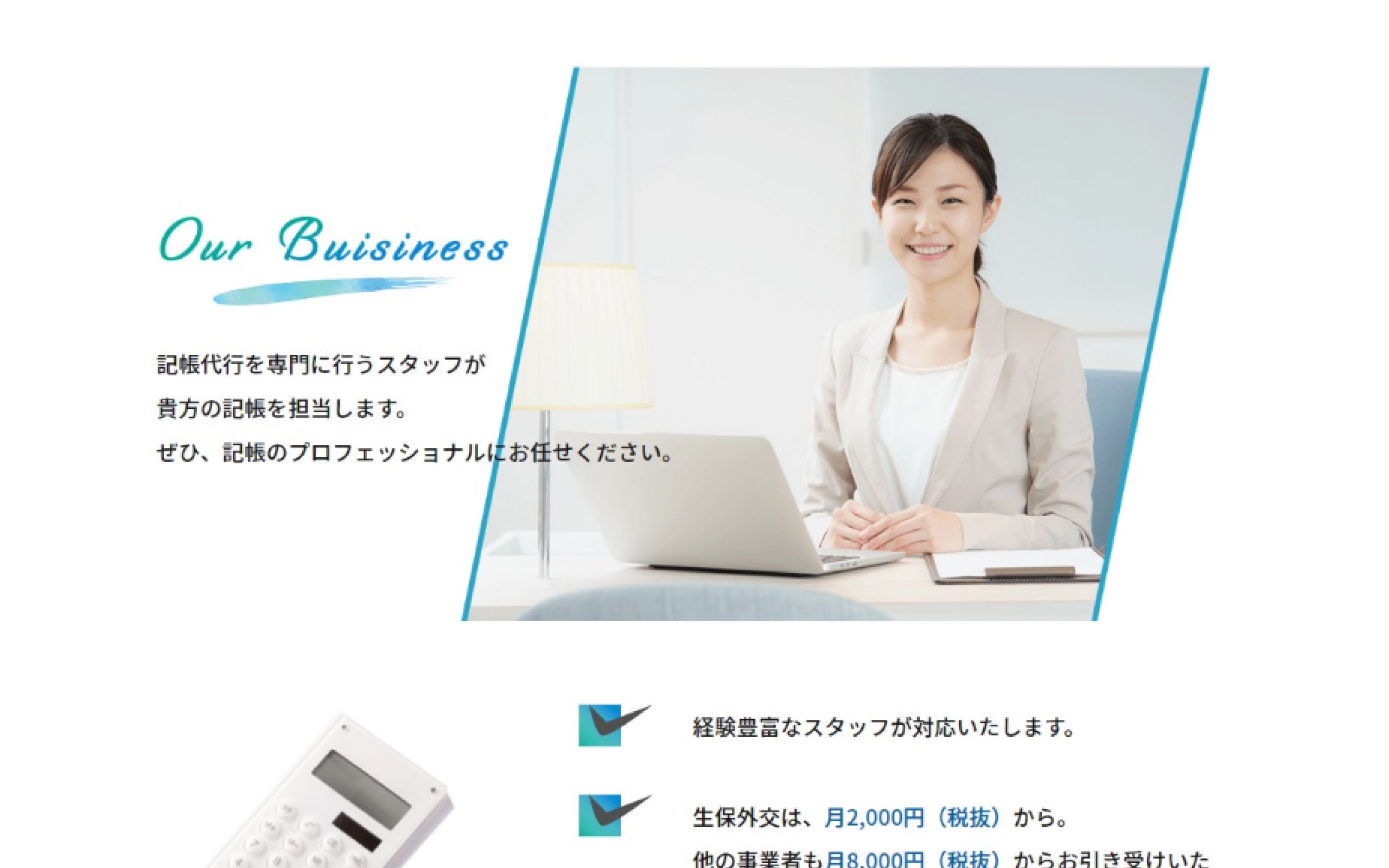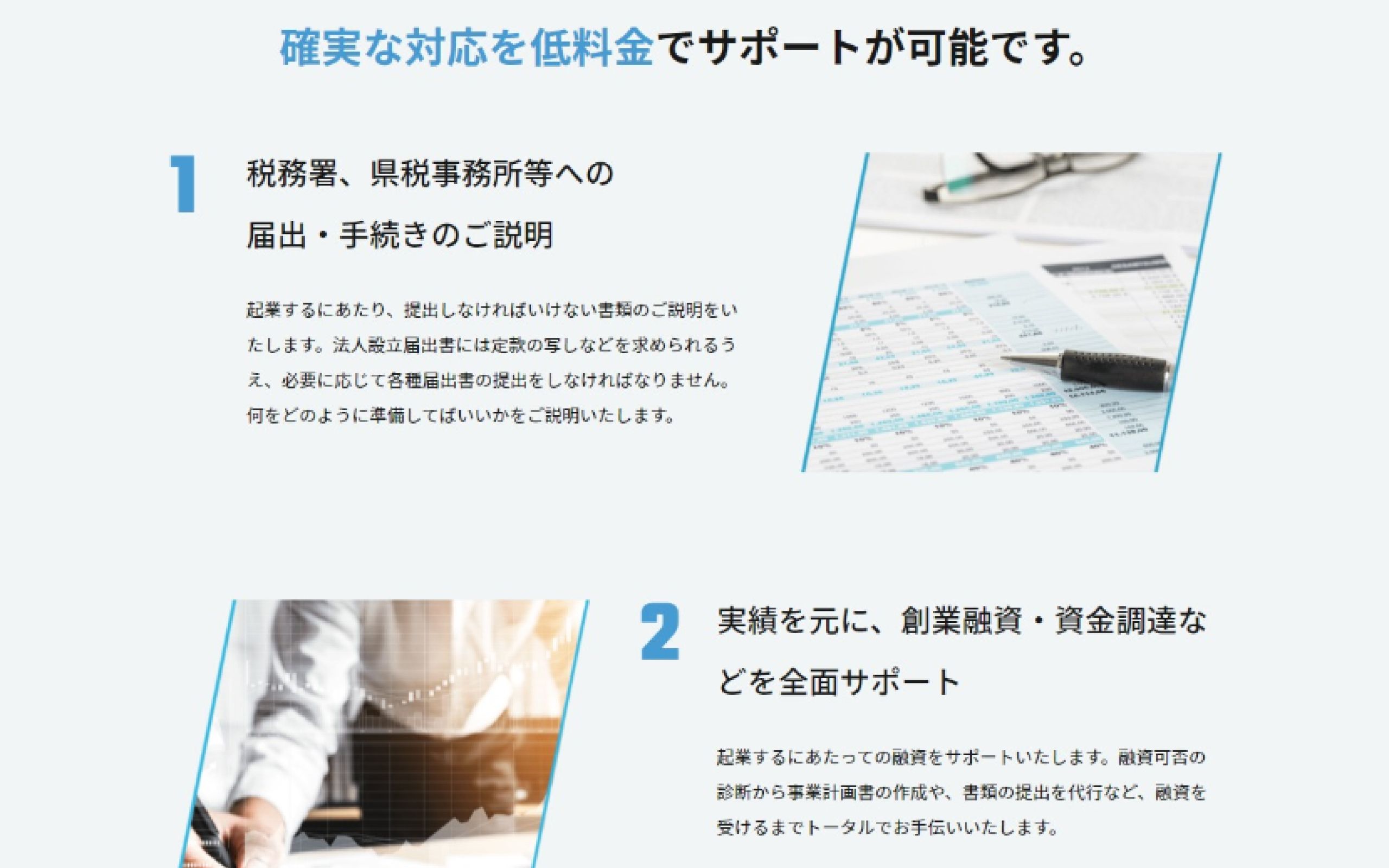 ページの構成からデザイン、執筆、コーディングと全てお任せいただきました。爽やかな、敷居を少しでも低くしたい、ということでしたので、税理関連のサイトですが、重厚感を無くし、柔らかい印象にいたしました。リスティング広告をもしかしたら行うかもしれないというお話をいただきましたので、各事業内容はLPのような作りをさせていただきました。