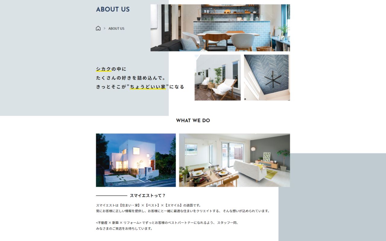 「スマイエスト」は、デザイン住宅に近しいサービスであるため、デザインチックな画像を多めに使用し「良い家感」が伝わるようなデザイン設計にしました。また視覚的にも「良い家感」が伝わるようなサイト構成を心がけました。