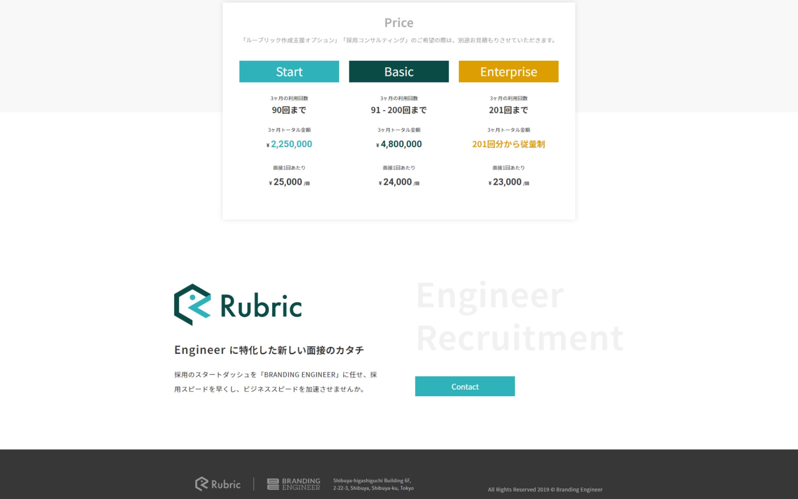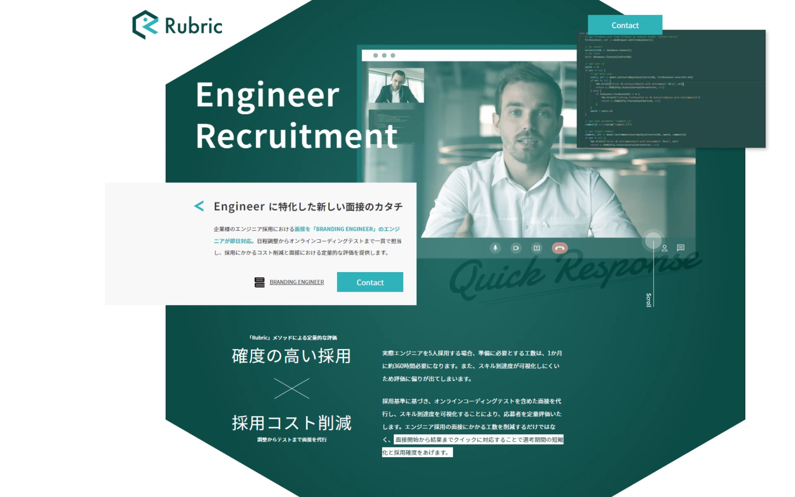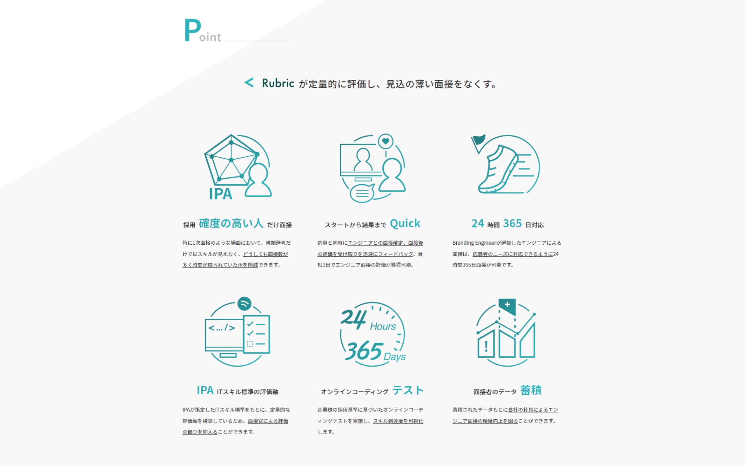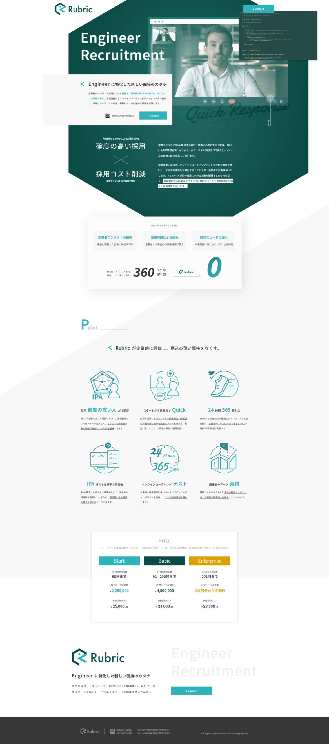 http://お客様のご都合により非公開「株式会社 Branding Engineer」はITエンジニアに特化した事業を展開しています。エンジニアのキャリアライフを一貫してサポートするための仕組みや、クライアントの様々なご要望にお答えできるよう、あらゆるサポート体制を整備しています。 新たにエンジニアに特化した採用代行サービス「Rubric」を展開するにあたり、NERDに新サービスサイトの制作をご依頼いただきました。