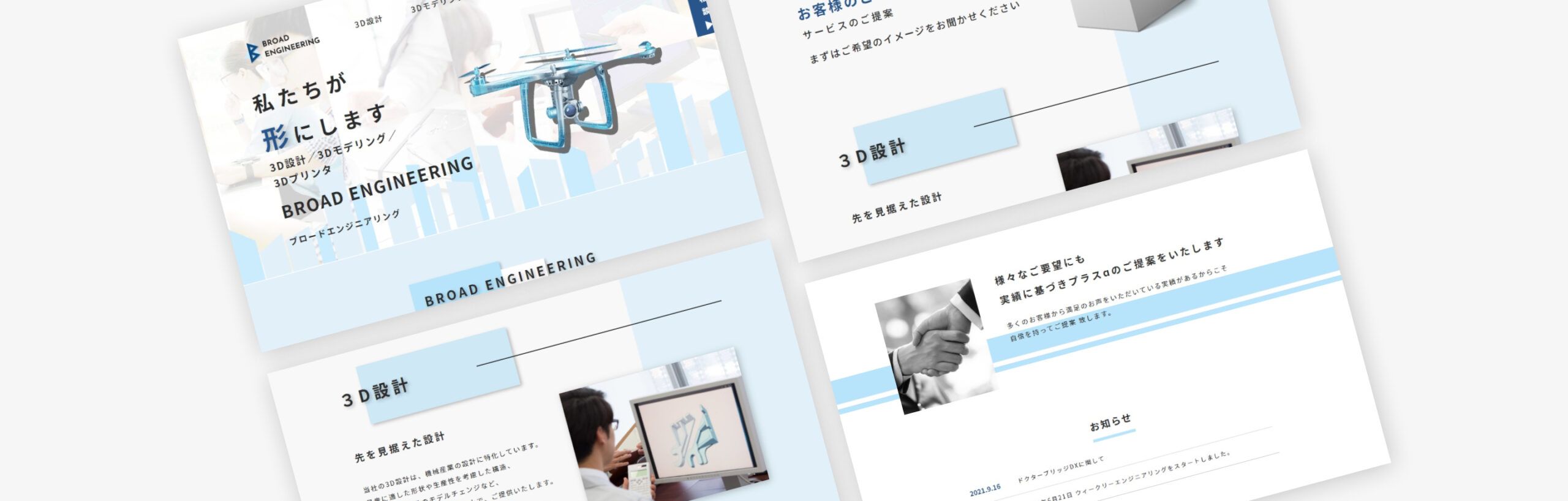 https://broad-eng.com/3D設計事業を手掛ける「有限会社ブロードエンジニアリング」様のコーポレートサイト制作の事例です。こちらの会社では3次元CADを使用して機械の3D設計や、3Dプロダクトモデルの作成、3Dプリンタ用データの作成など3D設計に関するサービスを提供されています。今回はコーポレートサイトリニューアルのご依頼をいただきました。「何をしている会社なのか」がわかりやすいサイトとなるようご提案させていただき、無事にリリースに至りました。