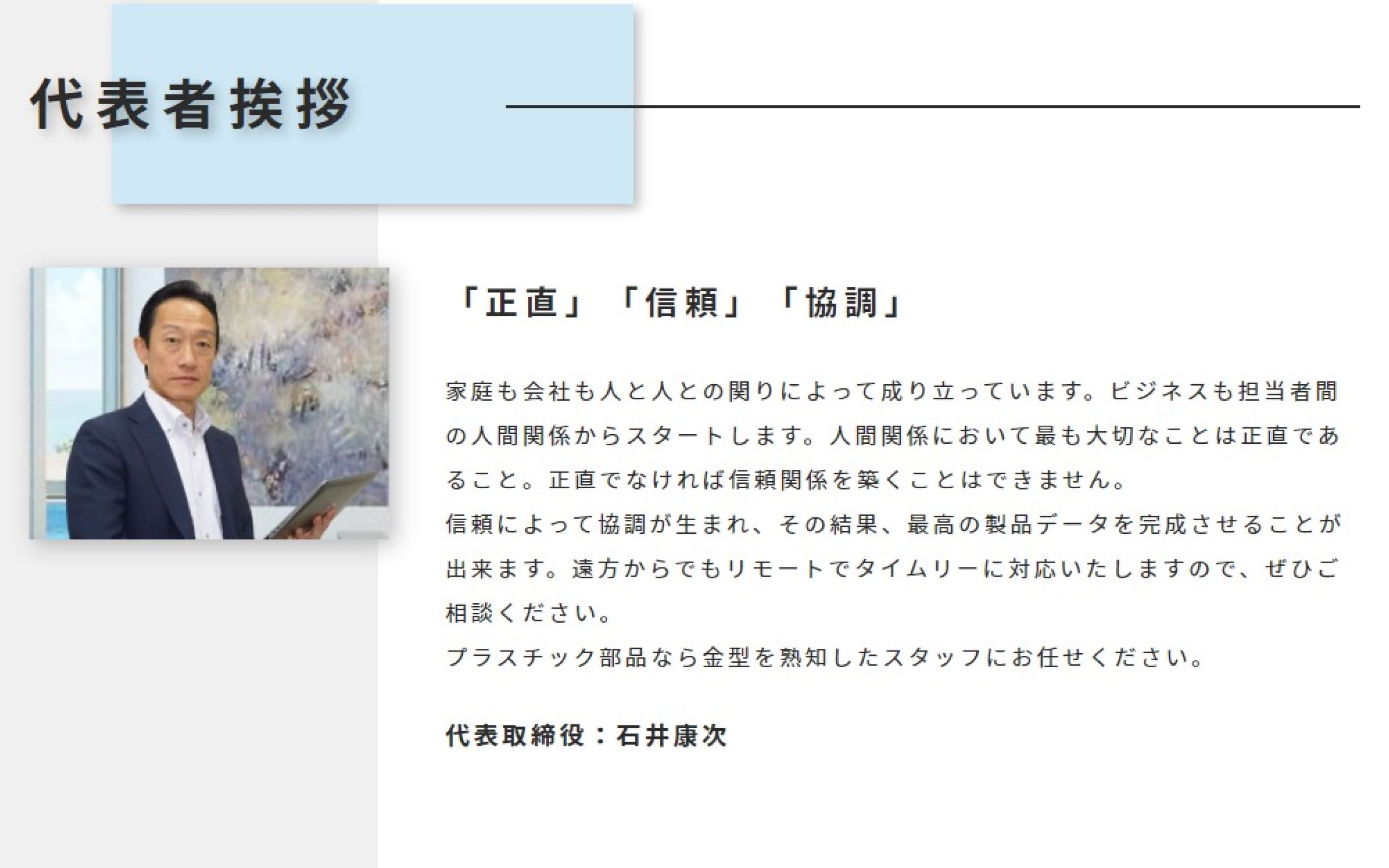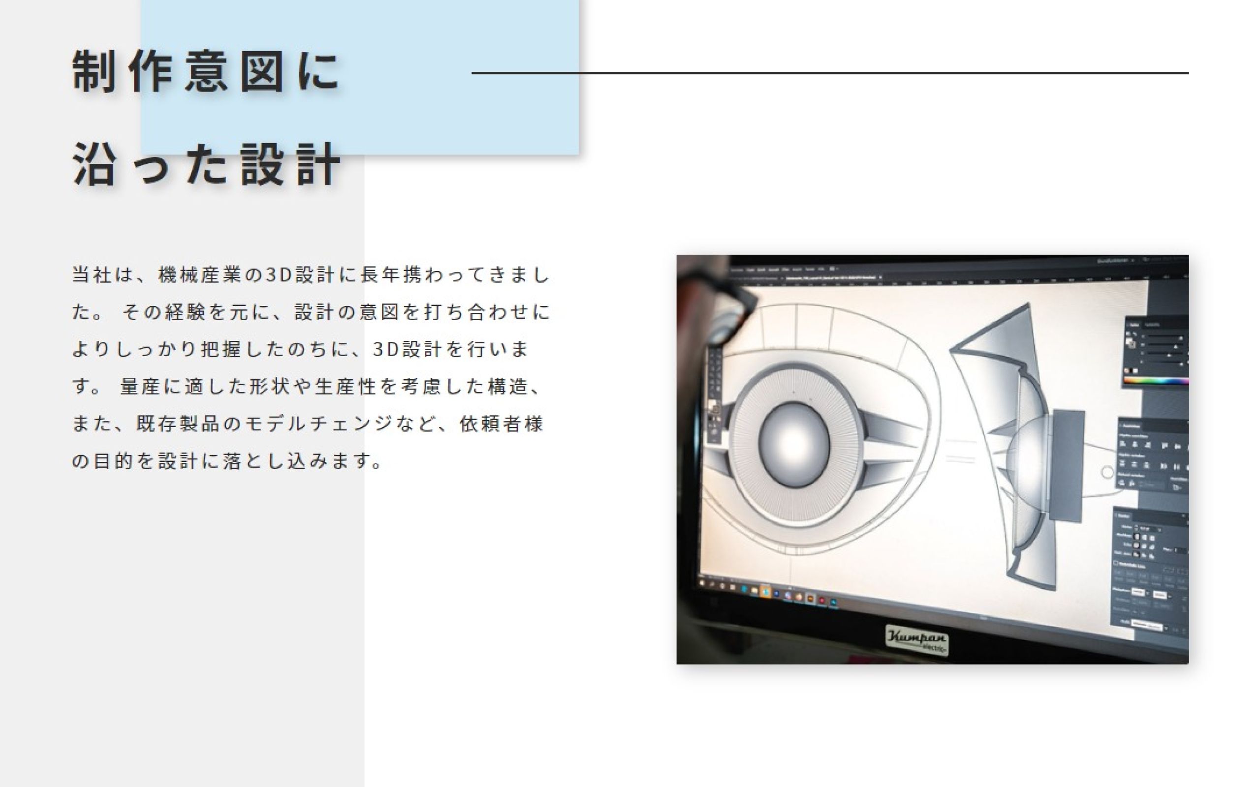 課題である「事業の内容」をわかりやすく記述し、toBでもtoCでも依頼できることが伝わるように致しました。また、機械設計やモデリングは固く、重めのイメージになりやすいため、重くなりすぎず爽やかな印象を与えるデザインに仕上げました。
