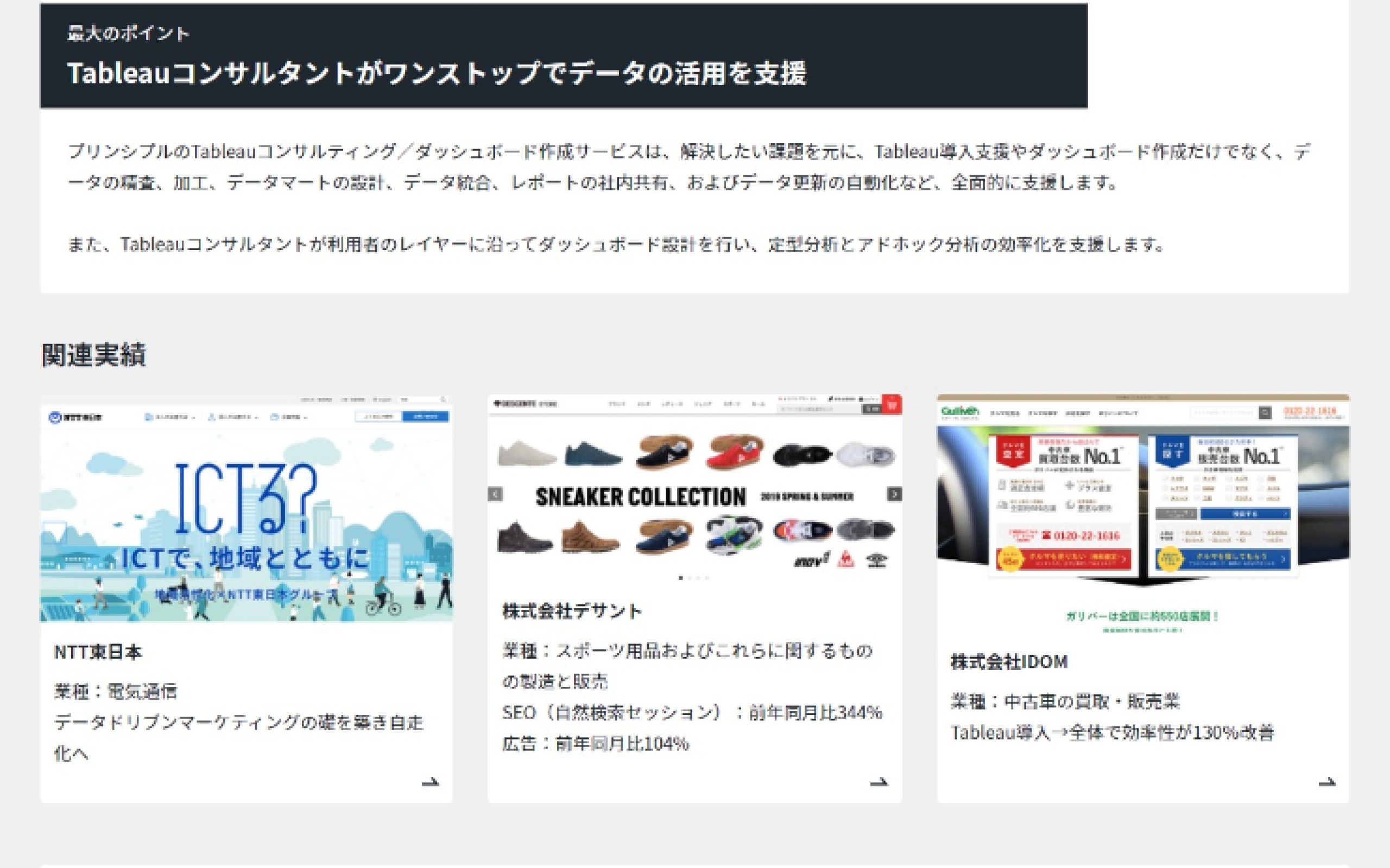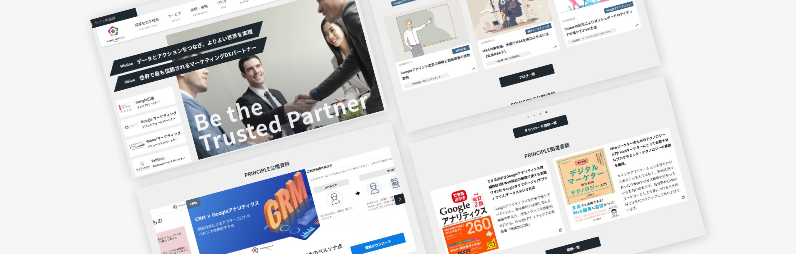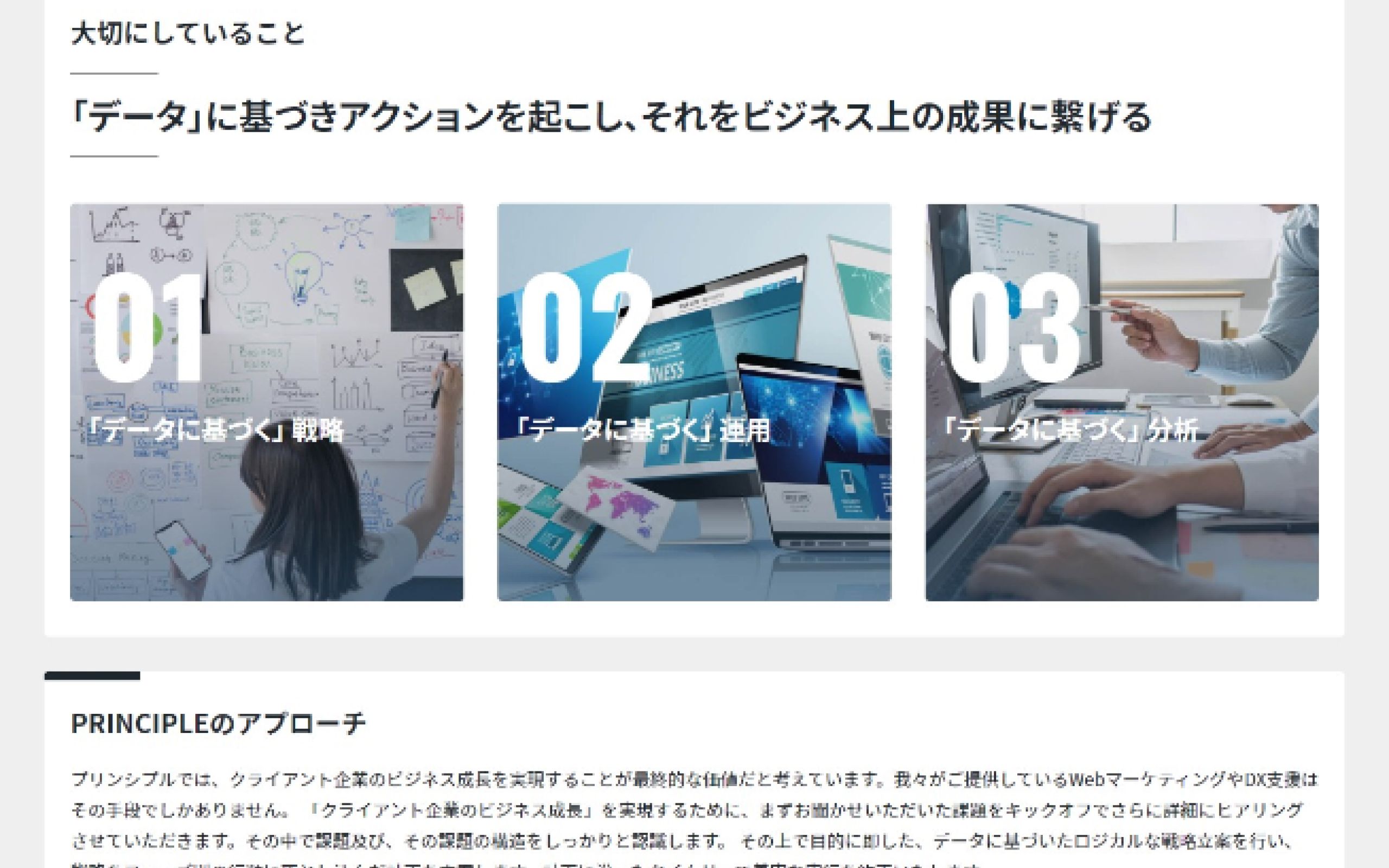 株式会社プリンシプル様は、デジタルマーケティングに関するコンサルティング会社です。しっかりとGoogleに評価されるような一歩踏み込んだ提案ができ、データ解析やデータ分析でよく使われるツール「Tableau(タブロー)」に信頼されているTableauサービスパートナーに認定されています。また、アメリカの「NASDAQ」上場を目標に掲げるグローバルな人材が集まる会社でもあります。今回、コーポレートサイトリニューアルをNERDにご依頼いただきましたが、「何をしている会社なのか」をわかりやすく伝えることが課題でした。