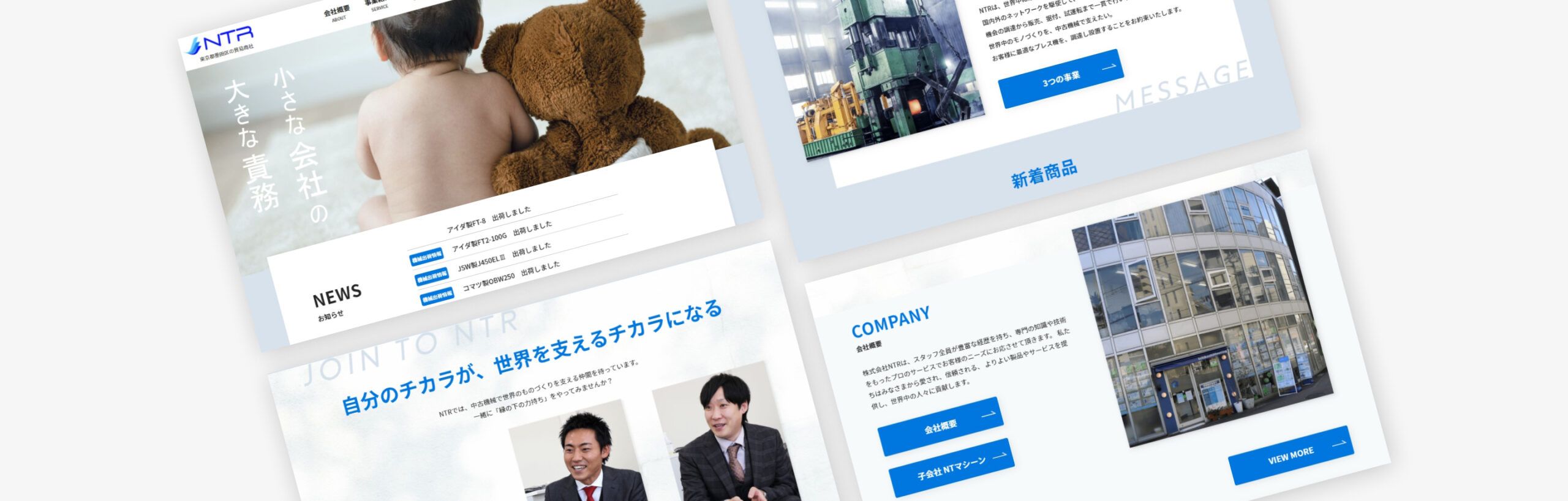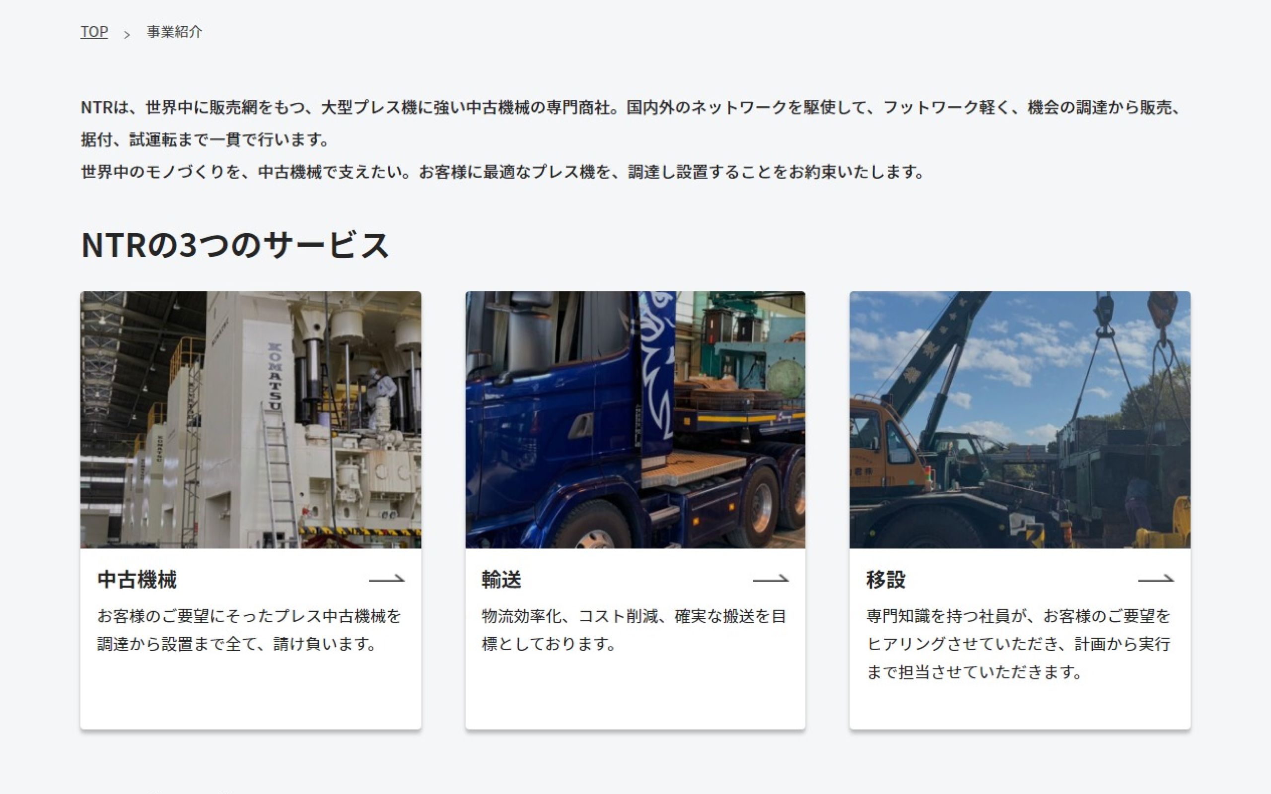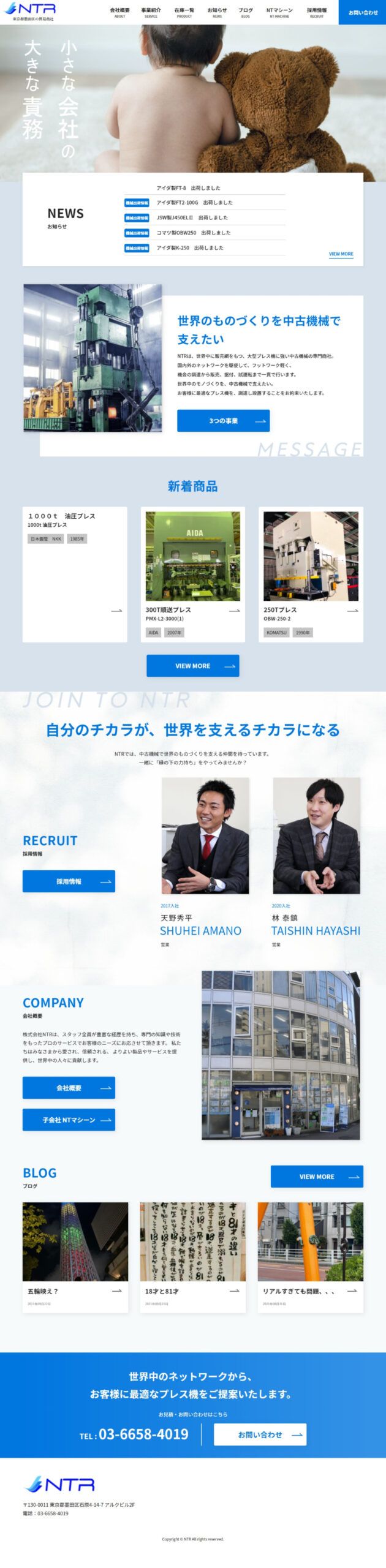 https://ntr-japan.com/板金に特化した中古機械の貿易商社「株式会社NTR」様のコーポレートサイト制作の事例です。ネットワークを駆使して、板金に必要な中古プレス機を国内外で仕入れ販売されております。Webにあまり精通されていらっしゃらないという課題を解決すべく、クライアント様が求めるサイトを提案、制作させていただきました。今後もぜひご活用いただければ幸いです。