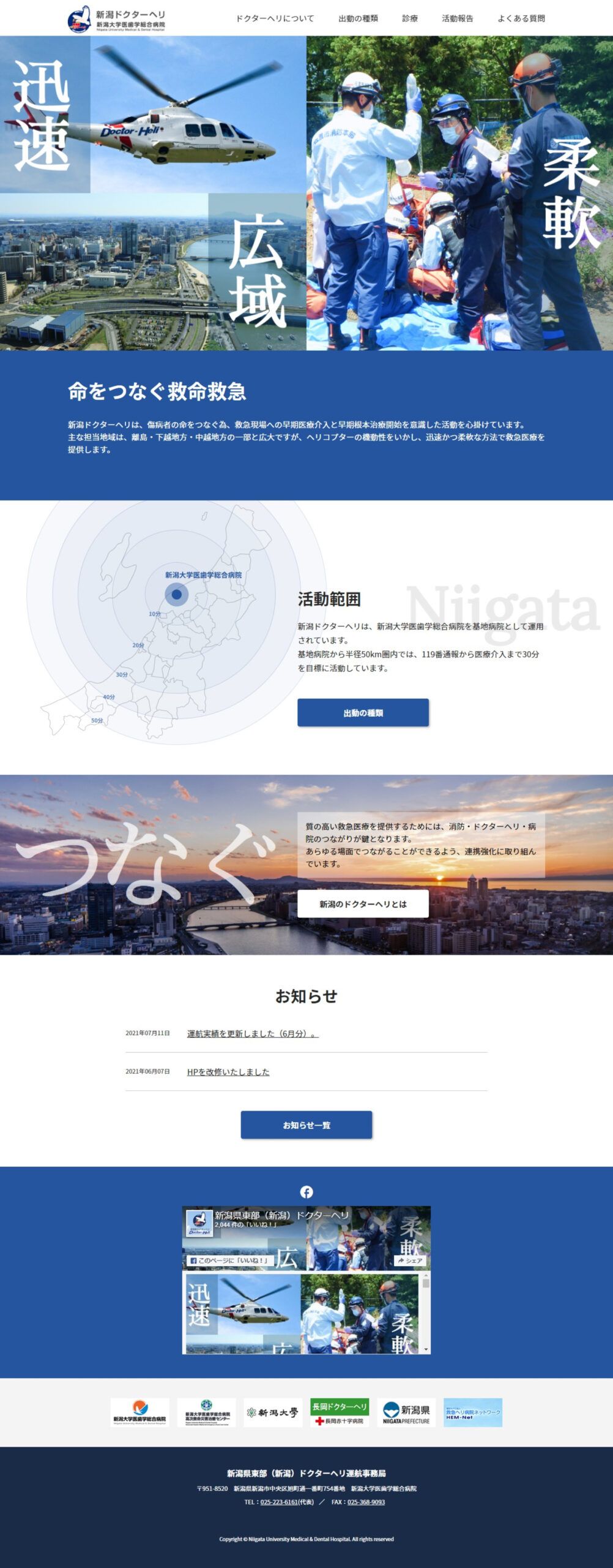 既に新潟大学様の他部署(救急医学講座)にてご評価いただいたことを受け、リピートとして新潟大学医歯学総合病院を基地病院として行われている「新潟ドクターヘリ」事業についての案件をお任せいただきました。ドクターヘリは、距離の離れた場所や被災地などにいる要救助者の救援・搬送の役割を担っています。元々のサイトは長い間使われていたため最新情報などが掲載できておらず、見にくい点もあったとのことで、サイトリニューアルのご依頼をいただきました。