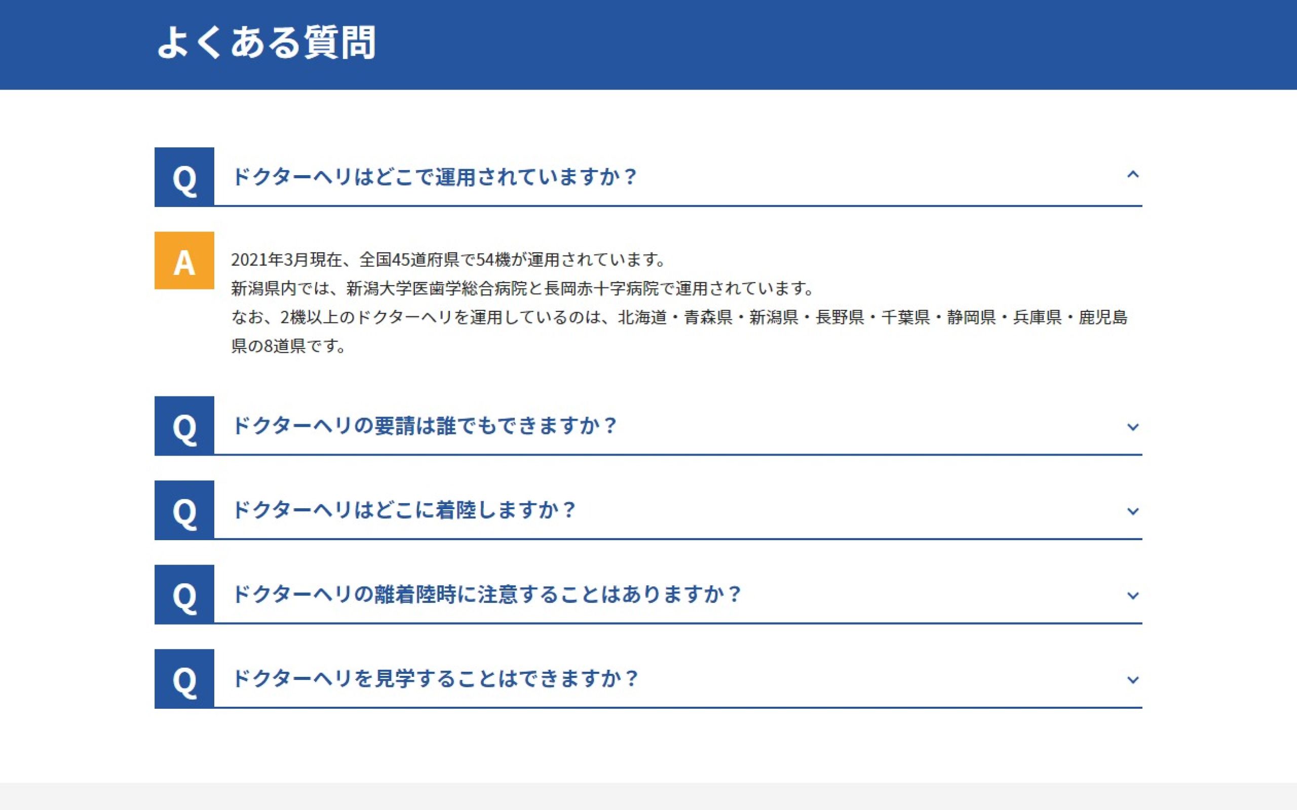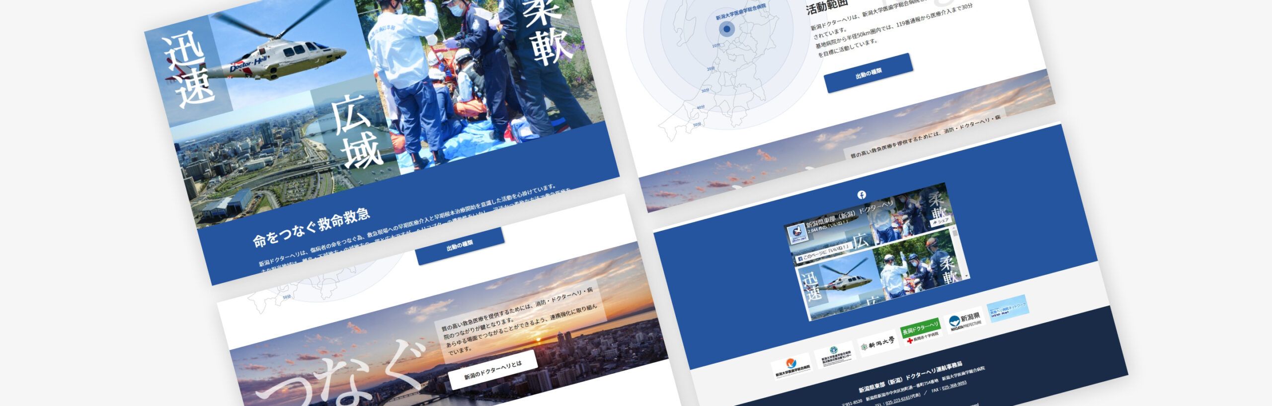https://www.nuh.niigata-u.ac.jp/drheli/ドクターヘリ事業を手掛ける「新潟県東部(新潟)ドクターヘリ運航事務局」様のコーポレートサイト制作の事例です。ドクターヘリは、病院から離れた被災地などに医師や看護師を派遣する救急医療専用のヘリコプターです。全国53機のうち、新潟県内では2つの基地病院に配備されており、今回その事業内容などを紹介するコーポレートサイト制作をお任せいただきました。元々あったHPのリニューアルということで、事業内容をわかりやすくまとめたほか、以前のHPで課題だった見にくかった点なども改善しております
