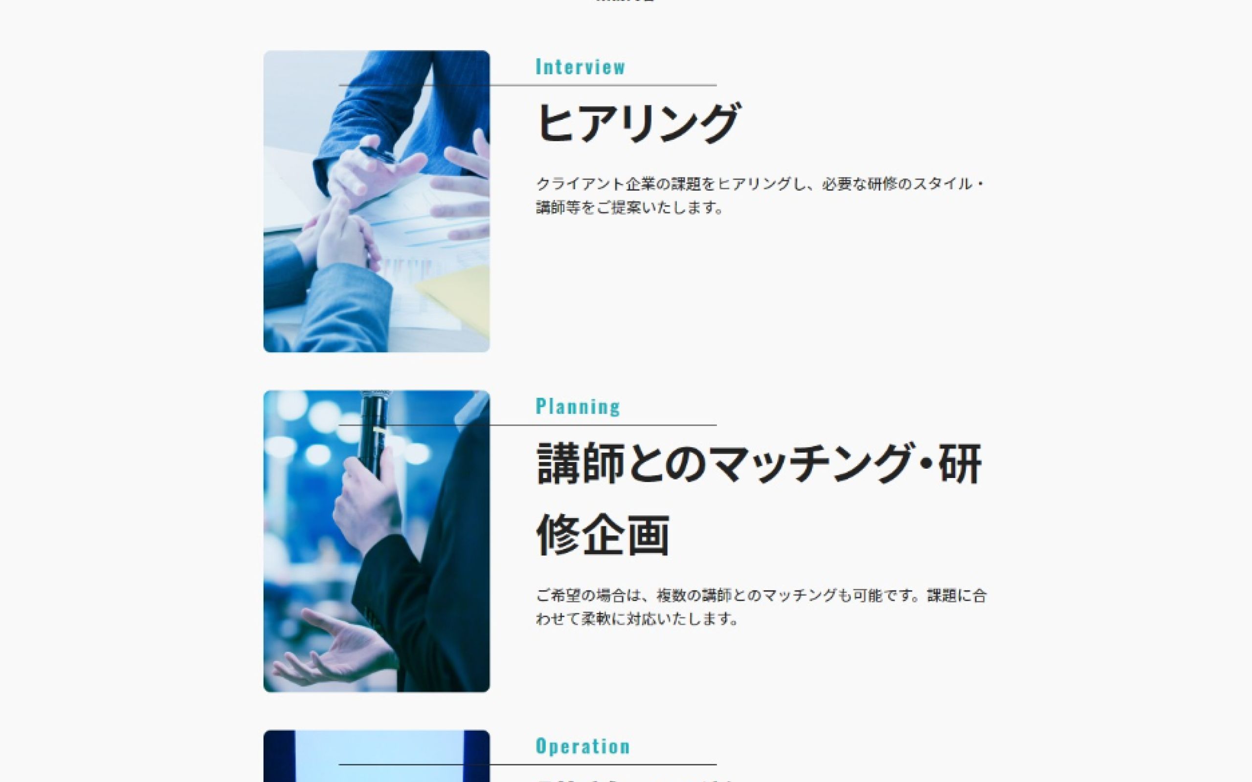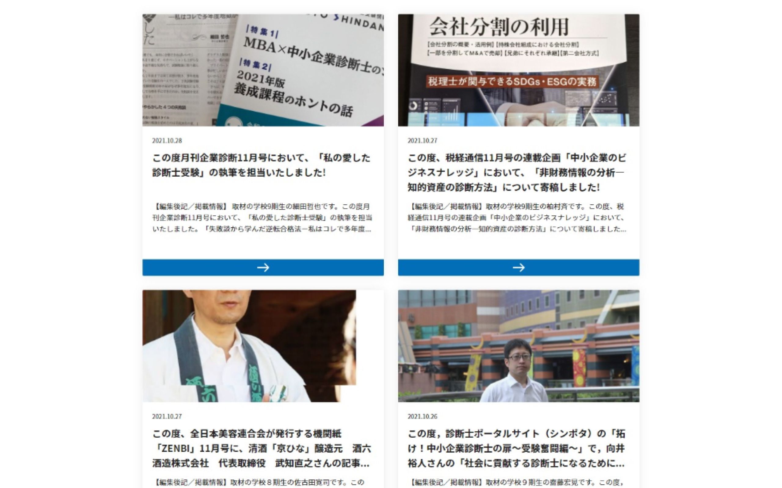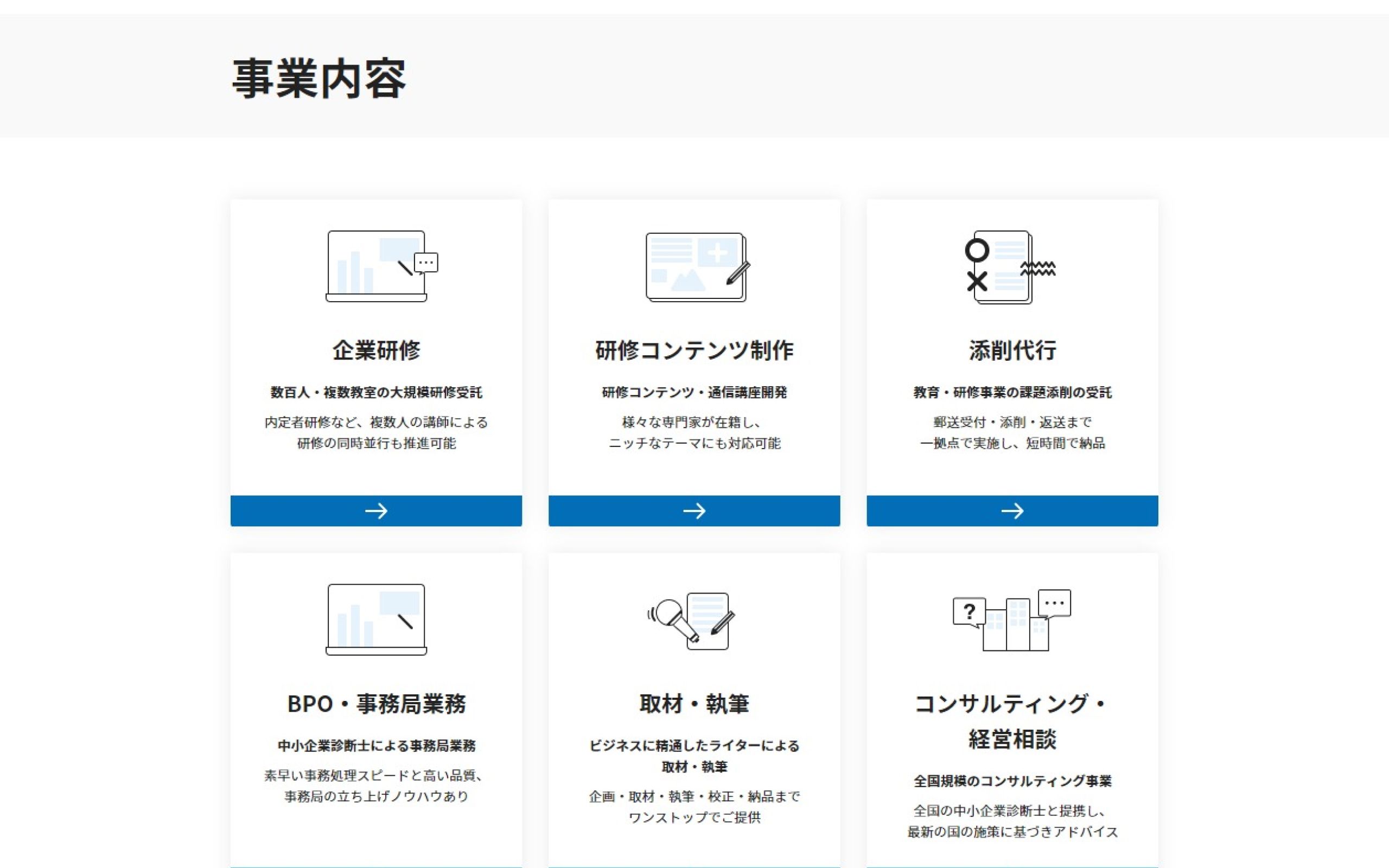 多角的に取り組まれている事業のなかでもとくに添削代行事業に力を入れたいとのことでしたので、この点を目立つように致しました。また、サイトを訪れたお客様がご覧になる「取材の匠」というページと、中小診断士向けにライティング技術を磨くための「取材の学校」というページがあり、それぞれ必要なコンテンツを必要としている方に見ていただくための導線設計を致しました。