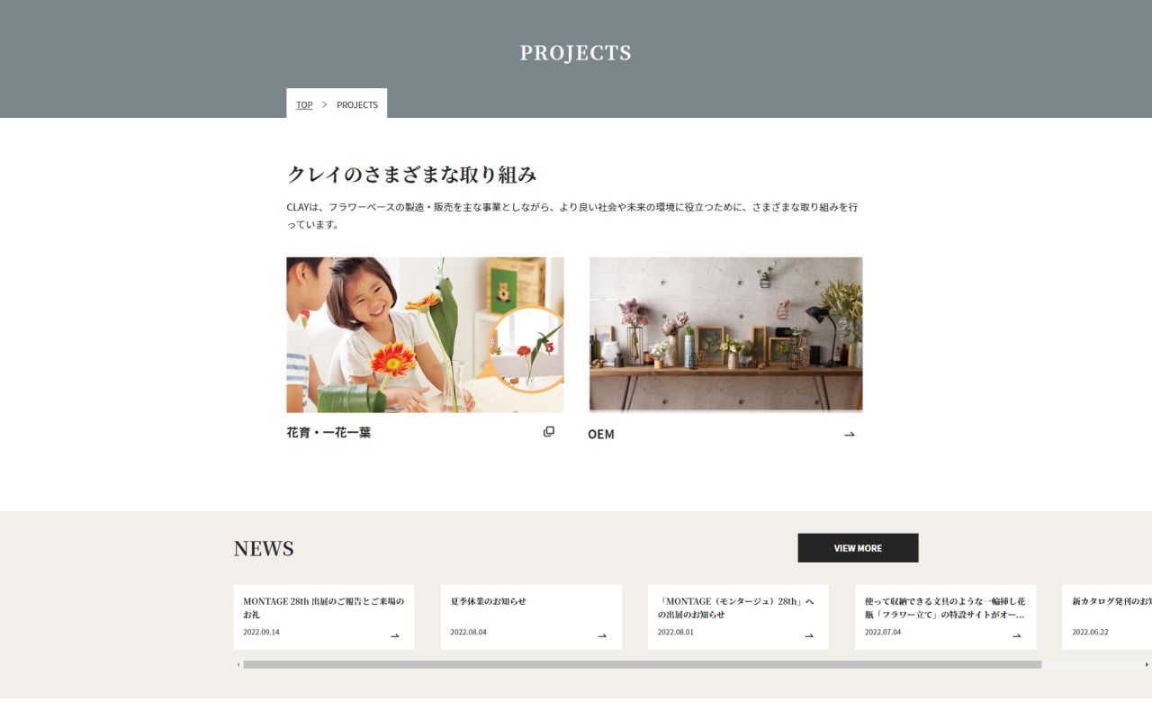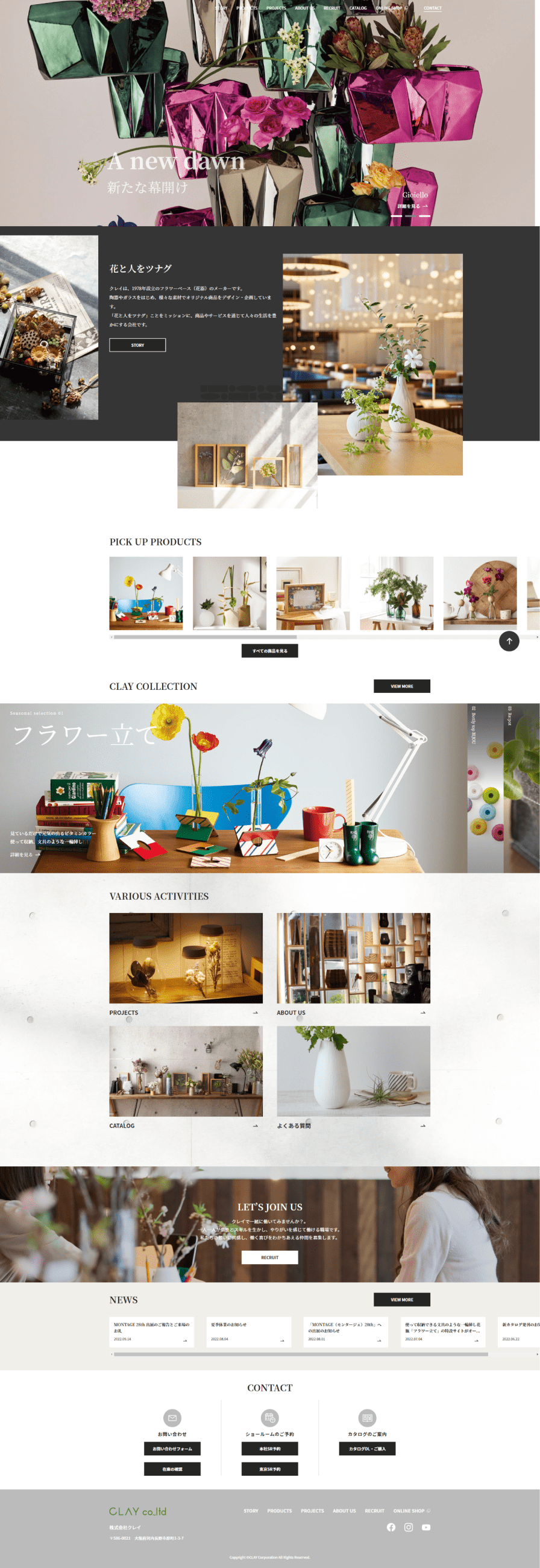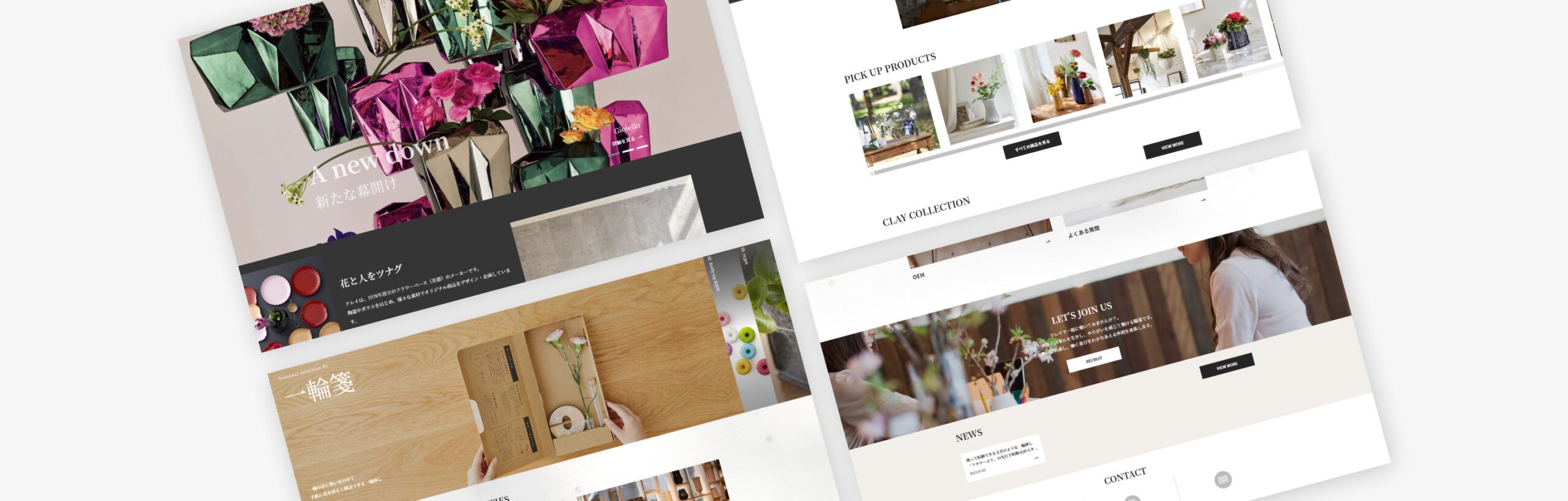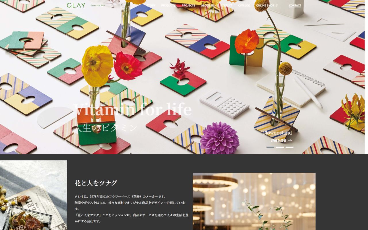 https://clay.co.jp/花瓶メーカー『株式会社クレイ』様のコーポレートサイト制作の事例です。ホームページを刷新するにあたり、「ホームページのデザイン性」と「更新のしやすさ」を兼ね備えた要件定義をさせていただき、最適なホームページの構成をご提案致しました。