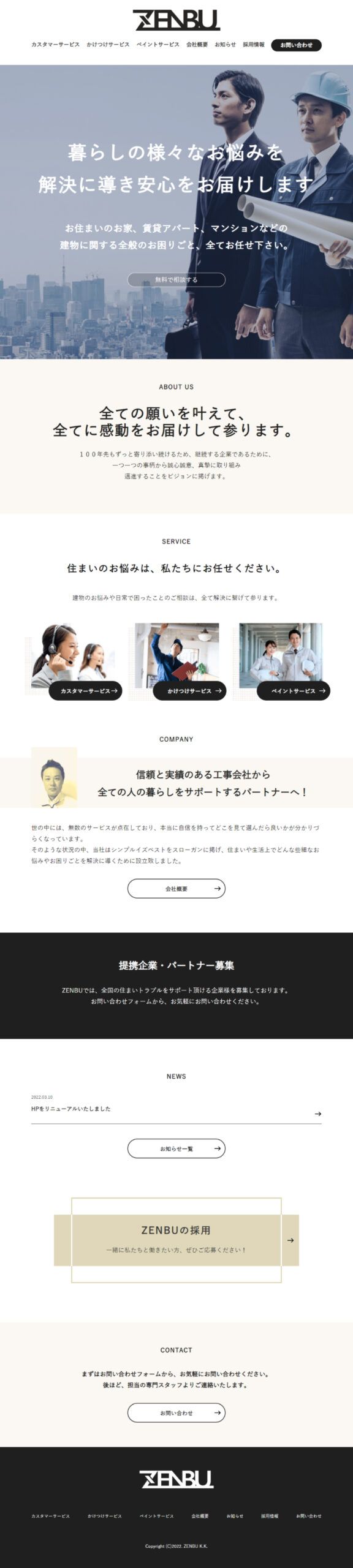 「ZENBU株式会社」は、住まい、建物に関する暮らしのお悩みを解決に導き、安心をお届けする企業です。外壁塗装から事業を開始され、現在ではコールセンターを手がけるなど、事業の幅が広がっています。「何をやっているかわからない」とZENBU様のお客様に言われてしまうことから、改めてコーポレートサイトのリニューアルさせ情報整理が必要でした。
