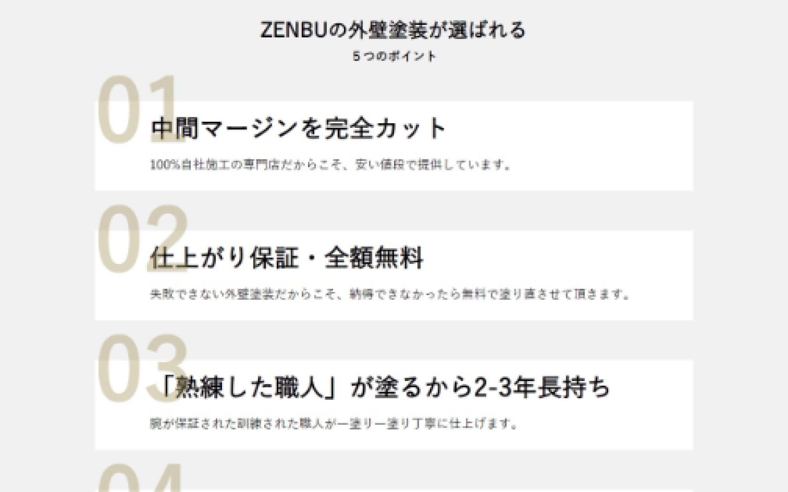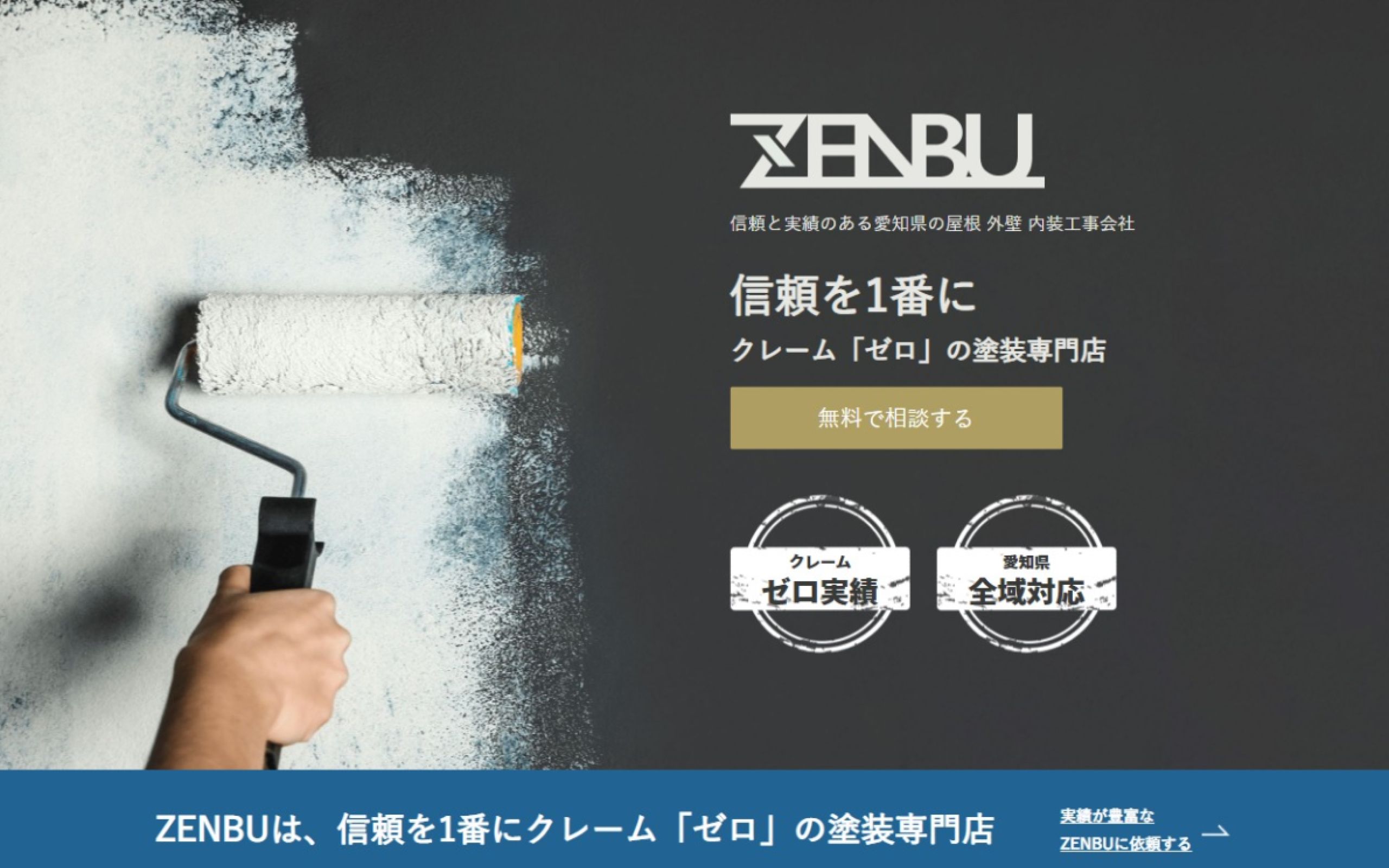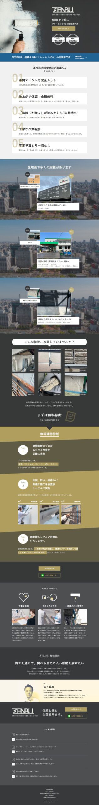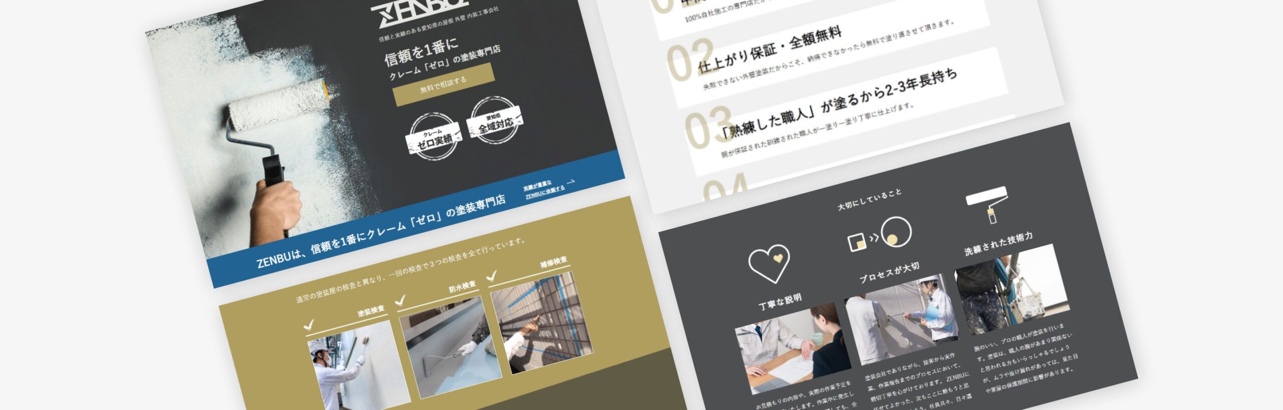 愛知県名古屋市にかまえる屋根・外壁・内装工事会社「ZENBU株式会社」」様のランディングページ制作の事例です。こちらの会社はクレーム「ゼロ」を掲げる塗装専門店であり、熟練した職人による外壁塗装で愛知県内で多くの実績を誇っています。これまでは口コミのみで受注されていましたが、露出を増やしさらなる受注増加につなげたいとの思いでNERDにご依頼いただきました。NERDでは競合他社のWebサイトの調査や業界内の動向などをお伺いしたうえで、他社としっかり差別化できるページをご提案させていただきました。広告運用もお任せいただき、引き続きサポートさせていただければ幸いです。