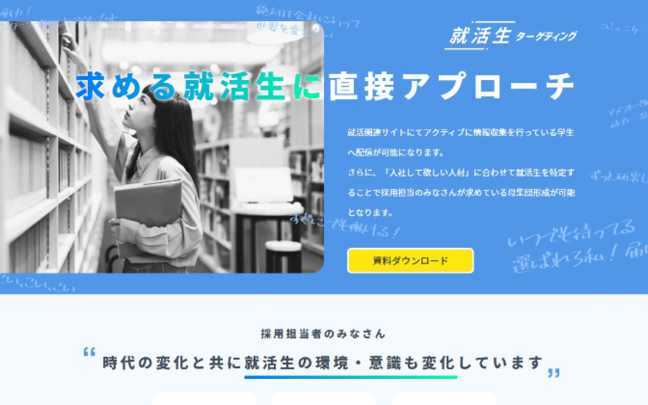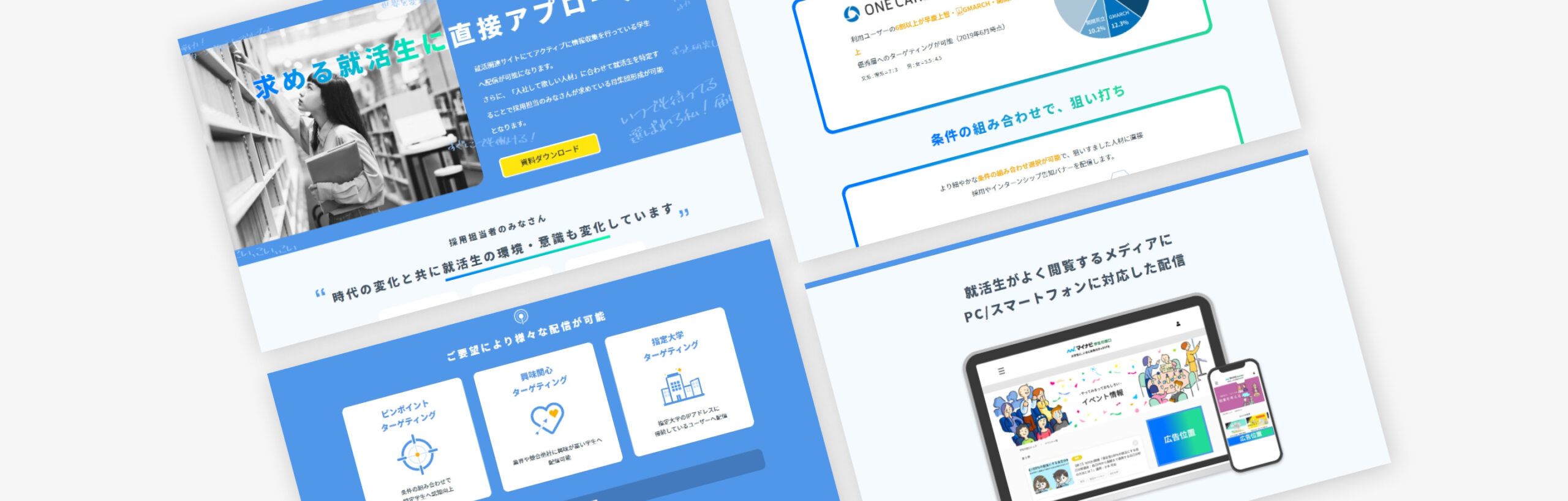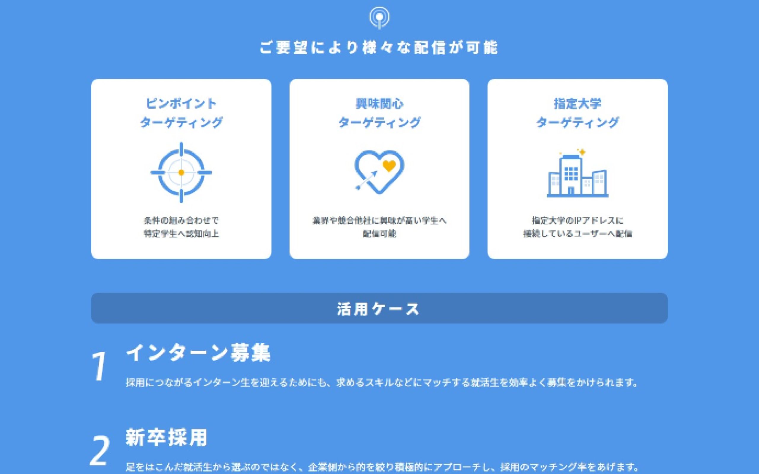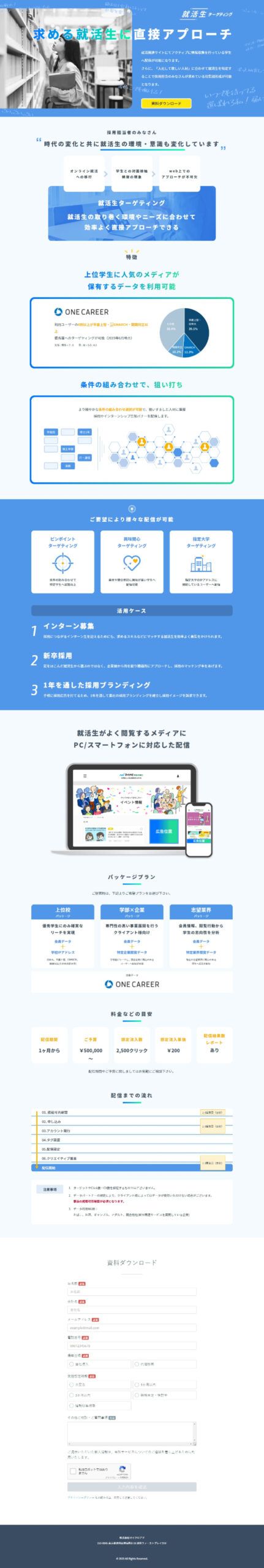 https://syukatsu-ad.microad.co.jp/データとテクノロジーを掛け合わせたマーケティングプラットフォームを提供する「株式会社マイクロアド」様のランディングページ制作の事例です。今回はアクティブな就活生に直接アプローチができる「就活生ターゲティング」サービスについてのLP制作をご依頼いただきました。特徴が分かりやすく伝わるようなサイトを要望されており、ターゲットが伝わりやすいビジュアルやサービスがわかりやすくなるよう図を用いて制作を進めさせていただき、先方の厚いご協力もあり無事に公開まで至りました。