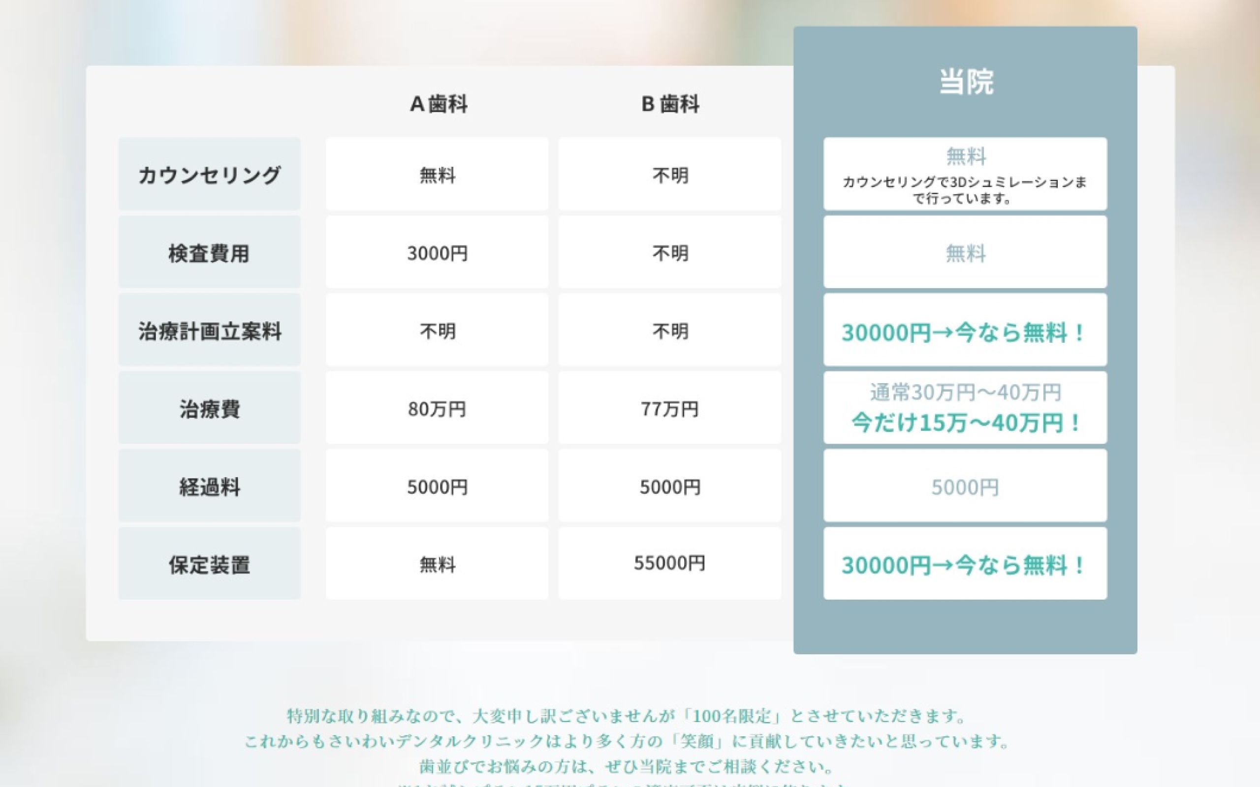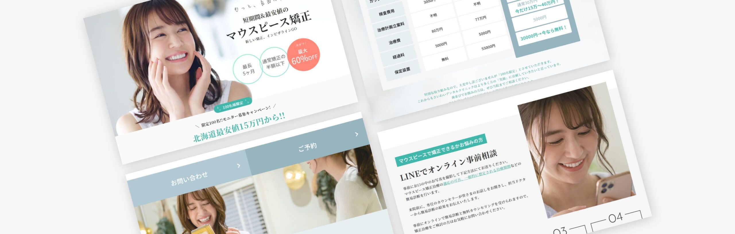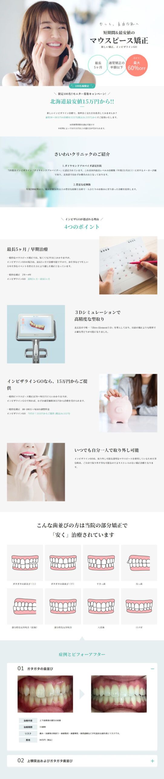 https://invisalign.saiwaidental.jp/北海道・北広島市に拠点を構える「さいわいデンタルクリニック」様のランディングページ制作の事例です。今回はマウスピース歯科矯正サービス「インビザライン」のなかでも前歯の悩みをお持ちの方にターゲットを絞った「インビザラインGO」についてLPを制作させていただきました。キャンペーンなどを活用して他社との価格競争に耐えうる内容にしたほか、既存の「インビザライン」のLPと周回できる仕様にしております。引き続き広告運用もご依頼いただき、しっかりとサポートさせていただきます。