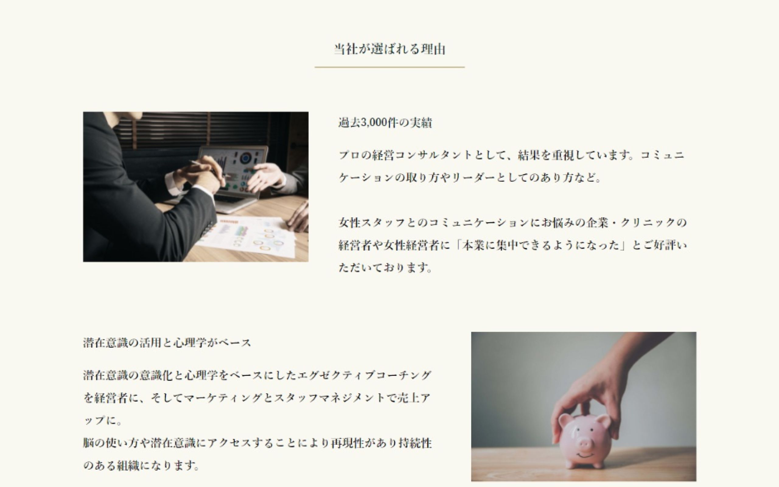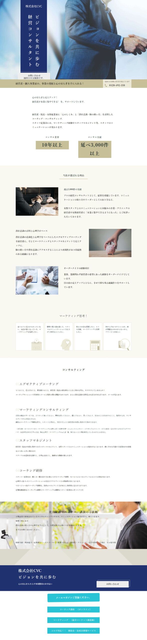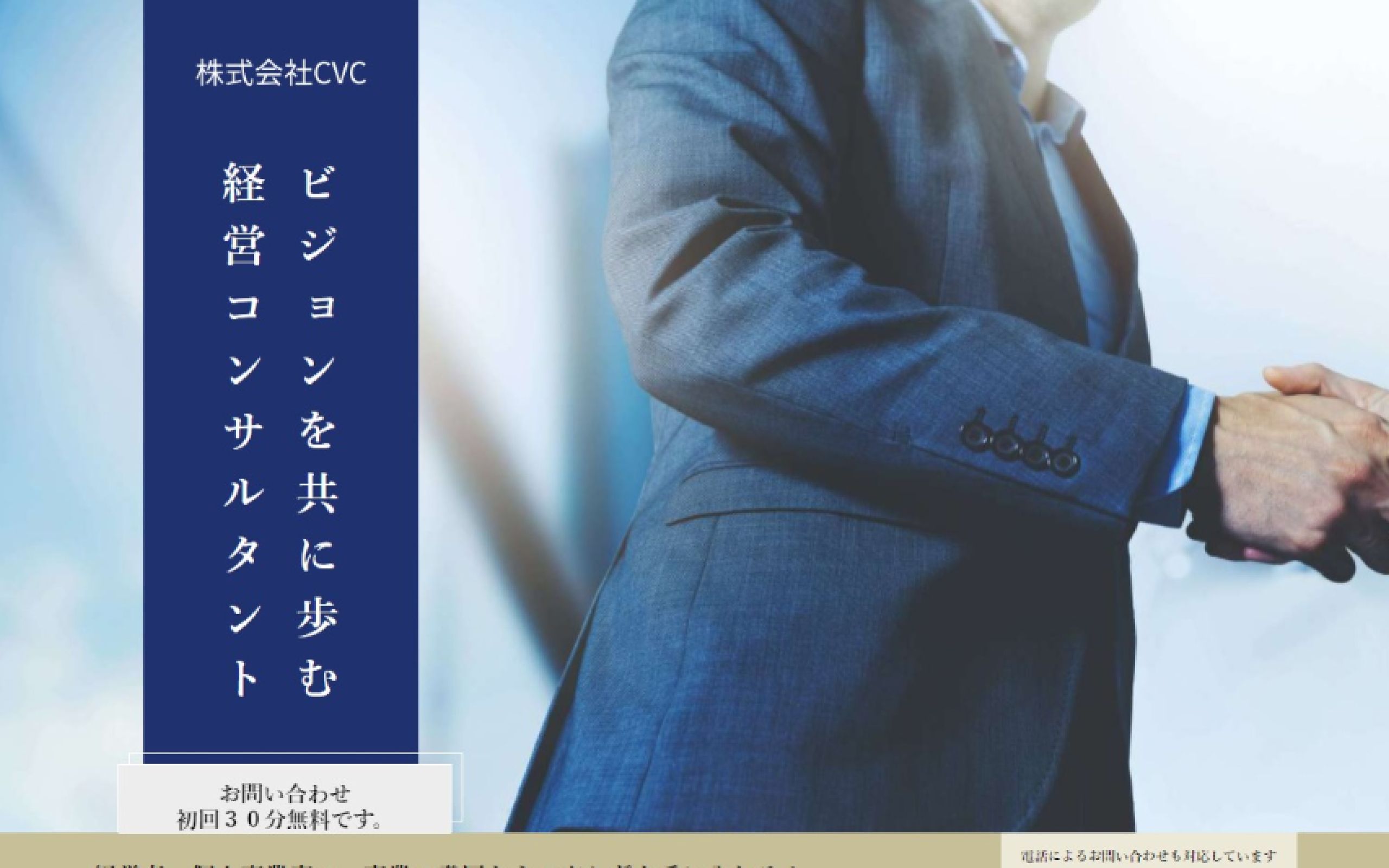 https://cvc358.com/大阪で経営コンサルタント業を営まれている株式会社CVC様のランディングページ制作の事例です。3,000件を超えるコンサルタント実績を誇り、企業経営者や個人事業家の方々をサポートされています。今回はホームページリニューアルのご依頼をいただき、短納期で信頼感が伝わるページをご要望されていました。内容、納期ともにご満足いただける結果となりました。