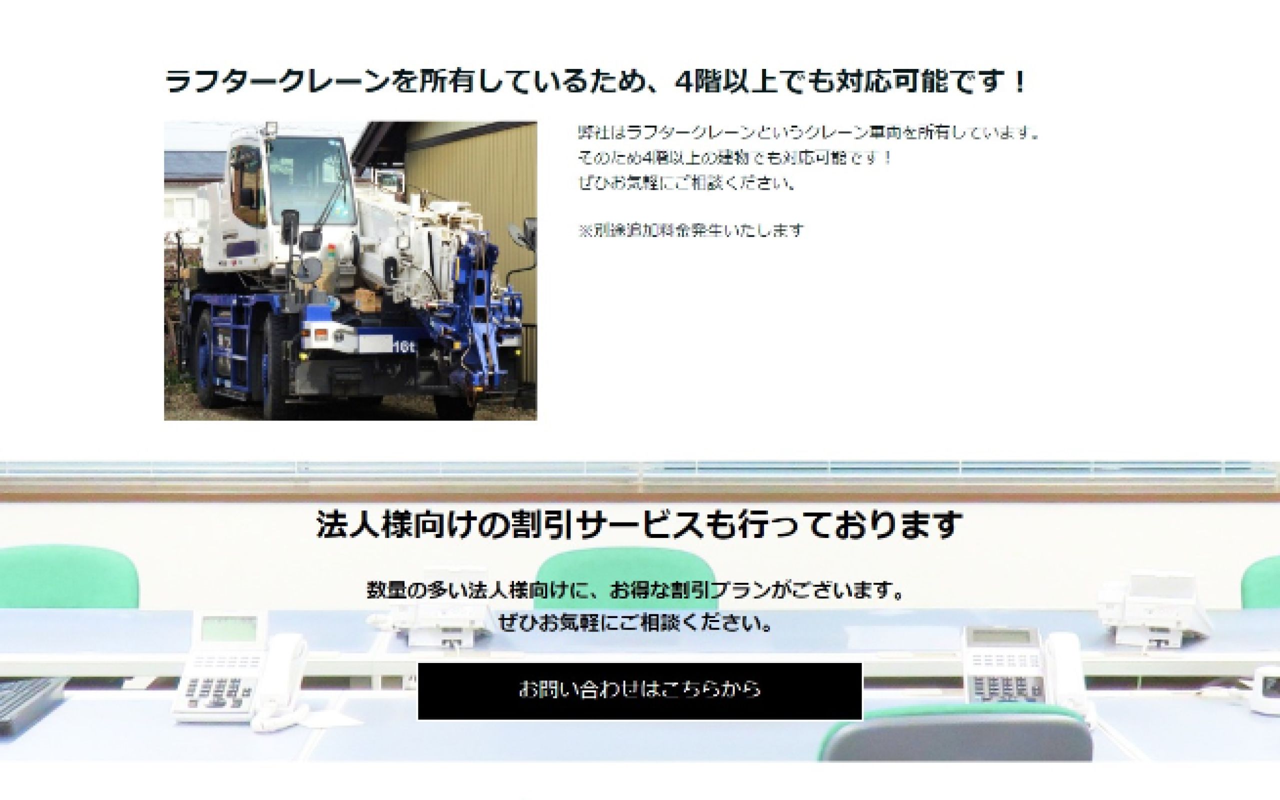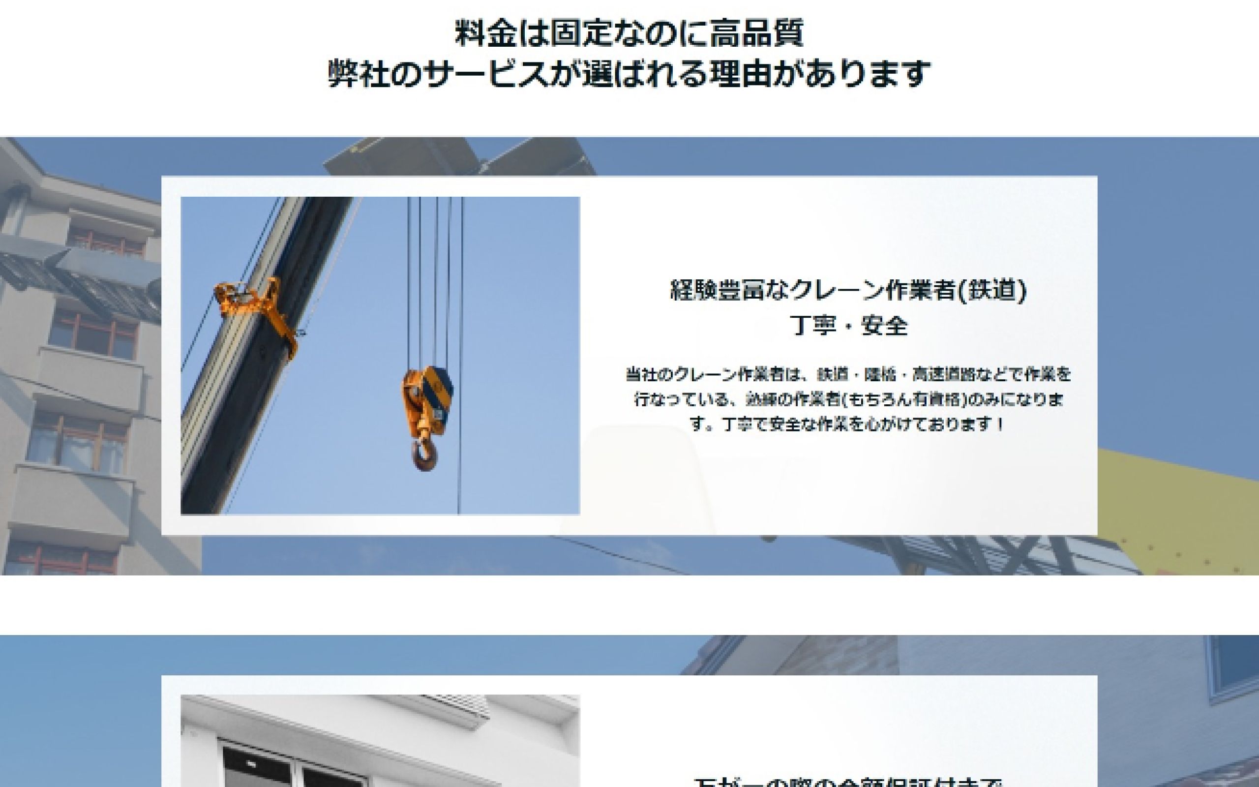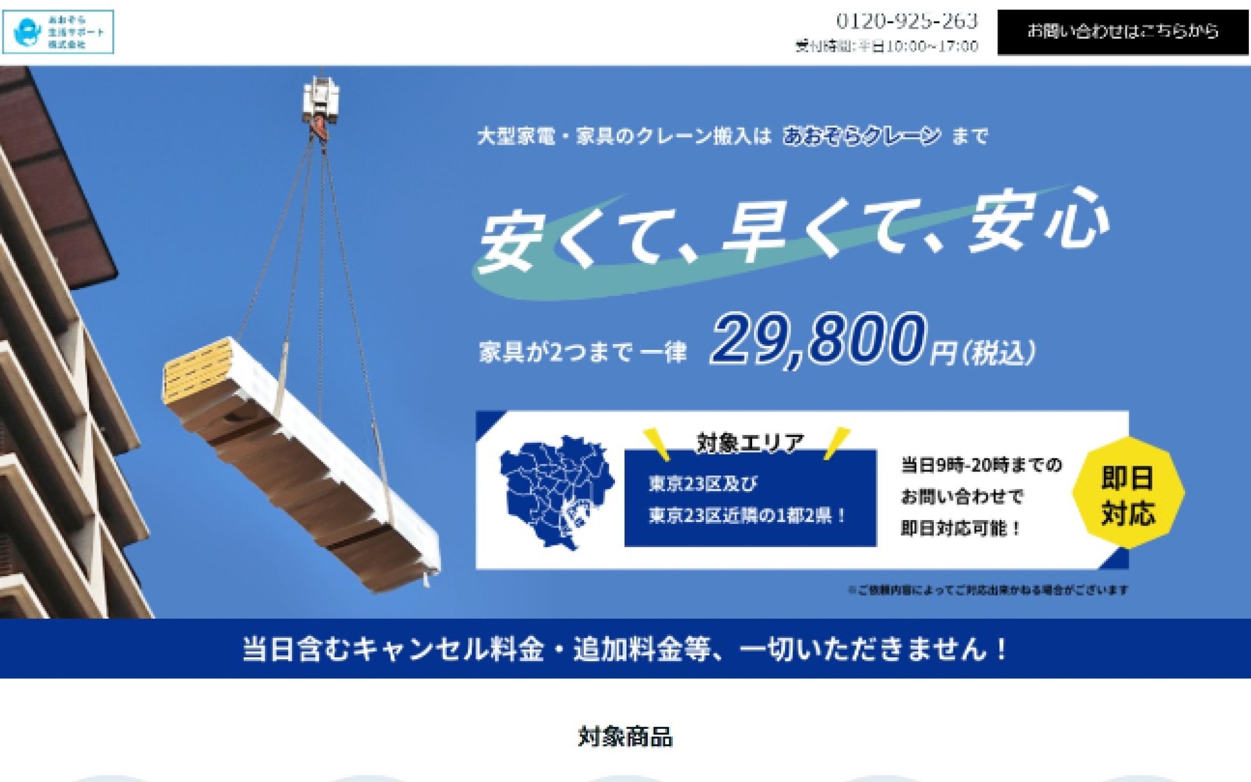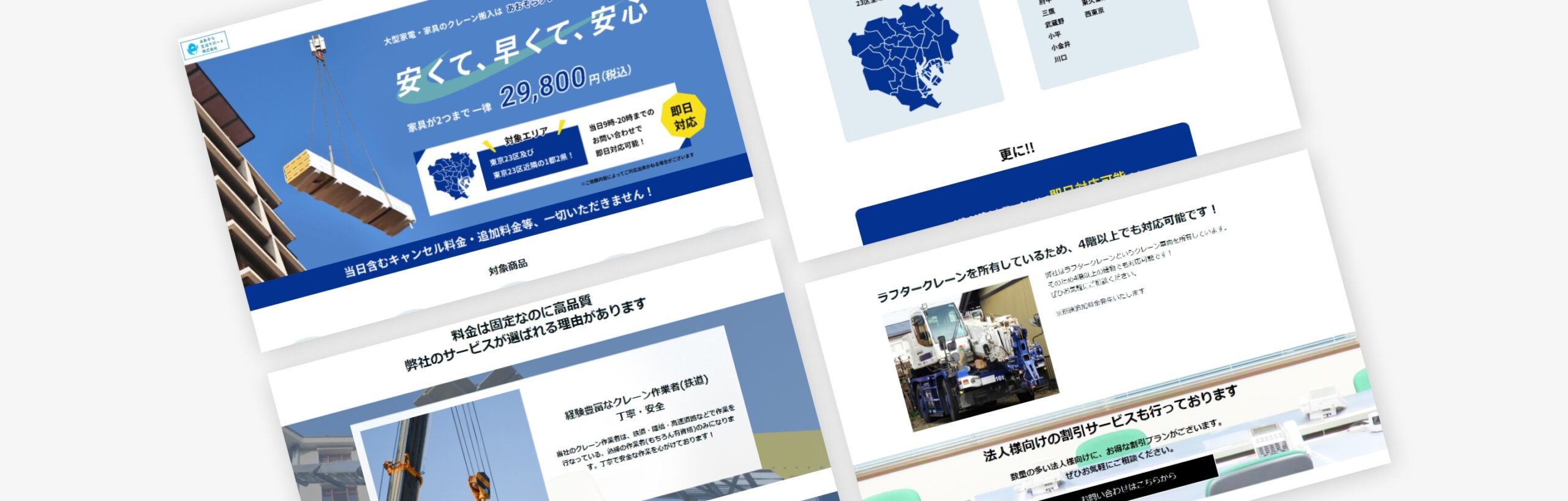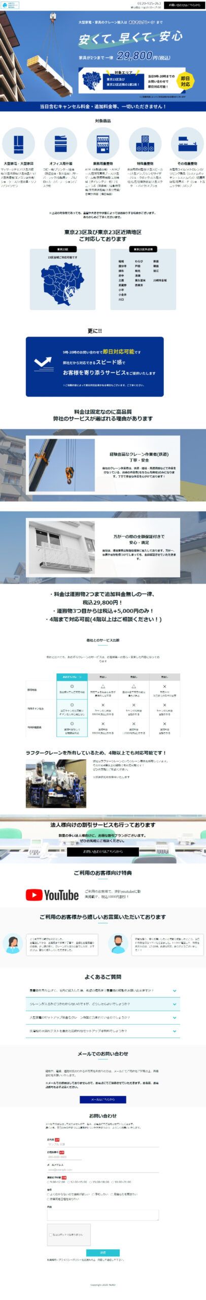 https://peraichi.com/landing_pages/view/8eh0d「あおぞら生活サポート株式会社」様のランディングページ制作の事例です。同社では「あおぞらクレーン」という運搬サービス事業が展開されており、大型の家具家電をはじめオフィス機器など様々な対象物をクレーンで運搬されています。こちらのサービスは家具は2つまで一律価格で、即日対応も可能、さらにクレーン作業経験者による高品質の作業という強みをしっかりと打ち出し、無事にクライアント様のご期待に沿えるサイトを納品することができました。