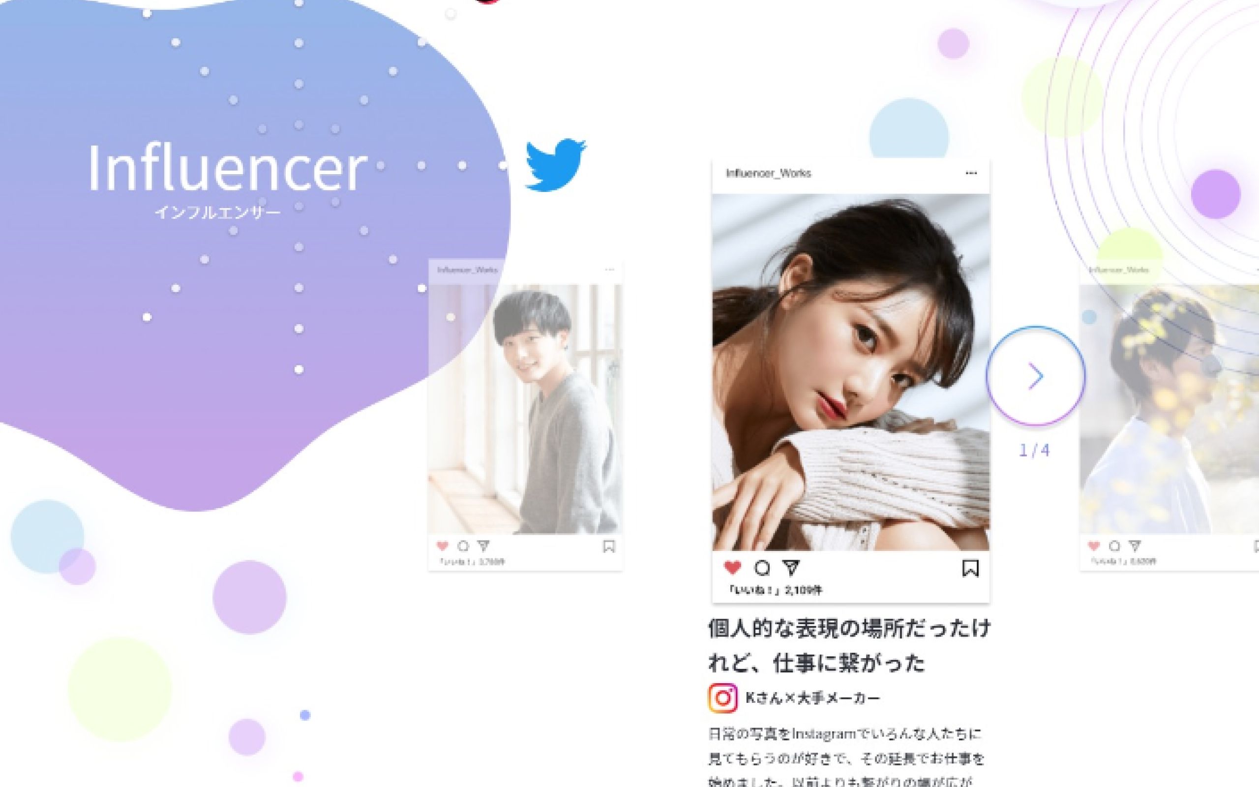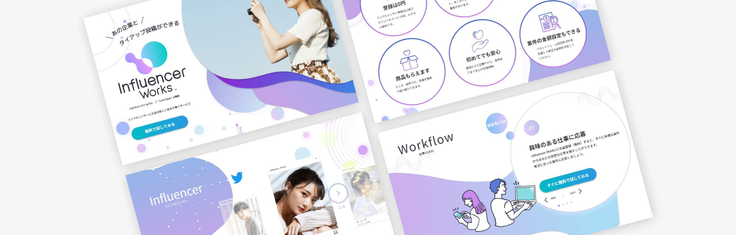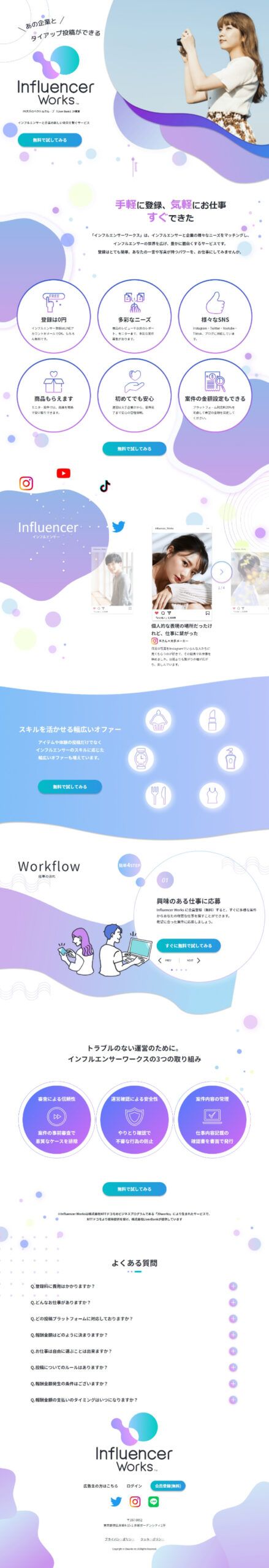 https://discover.influencer-works.com/インフルエンサーマッチングシステム「インフルエンサーワークス」を紹介するランディングページの制作事例です。こちらのシステムは株式会社NTTドコモが運営する新規事業創出プログラムの一環として提供されており、登録増加の課題解決のために新たなコンサルタントが介入するタイミングで、新しいLP制作をNERDにご依頼いただきました。インフルエンサー向け、広告主(企業)向けの2つのLPを制作し、それぞれターゲットに最適なアプローチができるようデザインを工夫致しました。