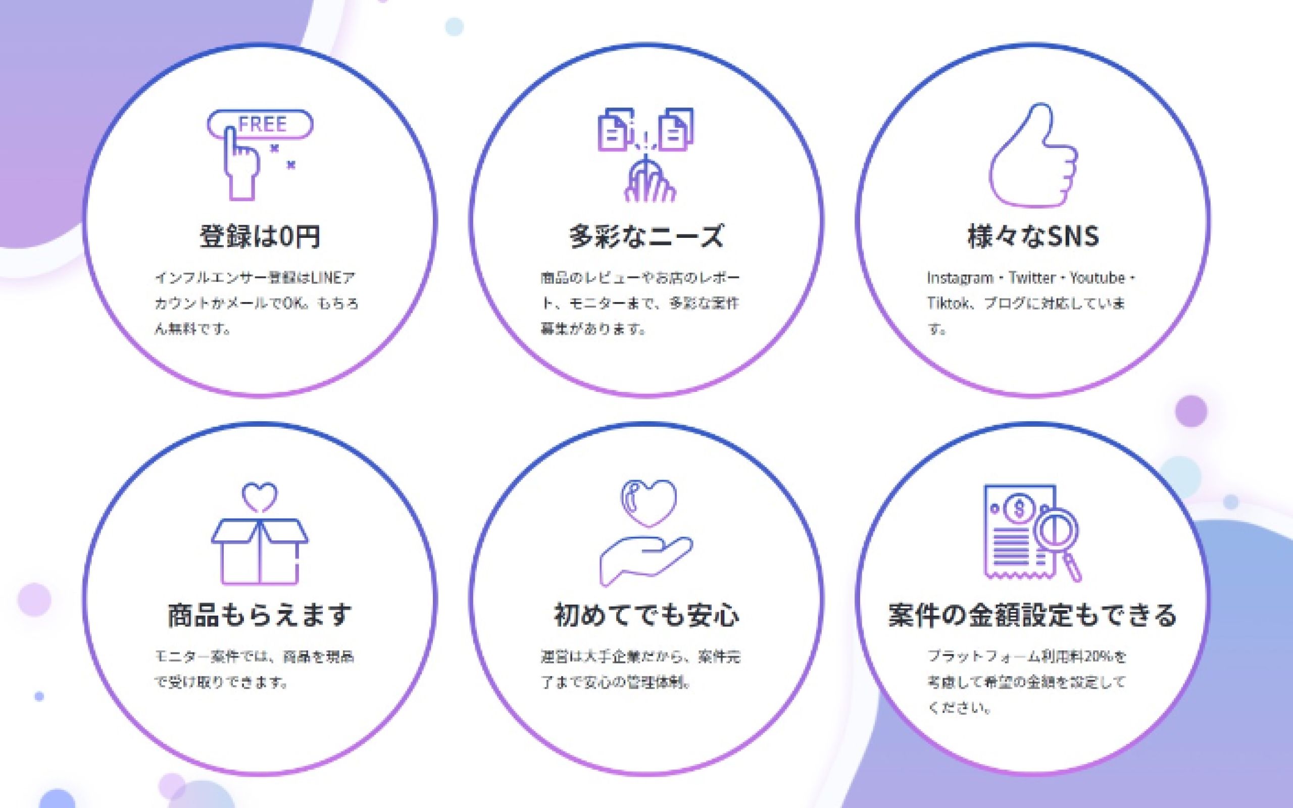 インフルエンサーは、SNS上で1,000~3,000人ほどのフォロワーを抱えている、または地域で注目されているような方をターゲットとしており、趣味の延長線上でも活用できることを伝え、より多くの方にご登録いただけることを目的としました。想定されるターゲットが若年層であるため、「面白く可愛らしく楽しく」をコンセプトに、曲線のモチーフやロゴなど遊び心のあるページに仕上げております。