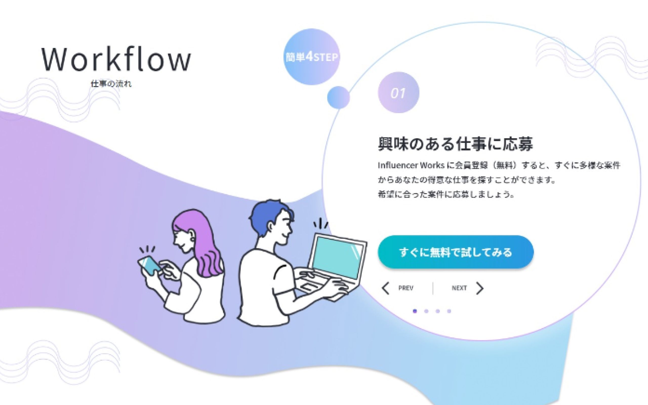 株式会社NTTドコモが運営する新規事業創出プログラム「39Works」の一環として提供されている「インフルエンサーワークス」というシステムについてのインフルエンサー向けランディングページ制作の事例です。「インフルエンサーワークス」とは、広告主(企業)とSNSで情報を発信するインフルエンサーを結び付けるマッチングシステムです。今回、システムへ企業・インフルエンサー双方の登録が伸び悩んでおり、それぞれの登録を促すLP制作をNERDにお任せいただきました。当初、ユーザーにどのようにアプローチするかが明確に定まっていないという課題を抱えていらっしゃいました。