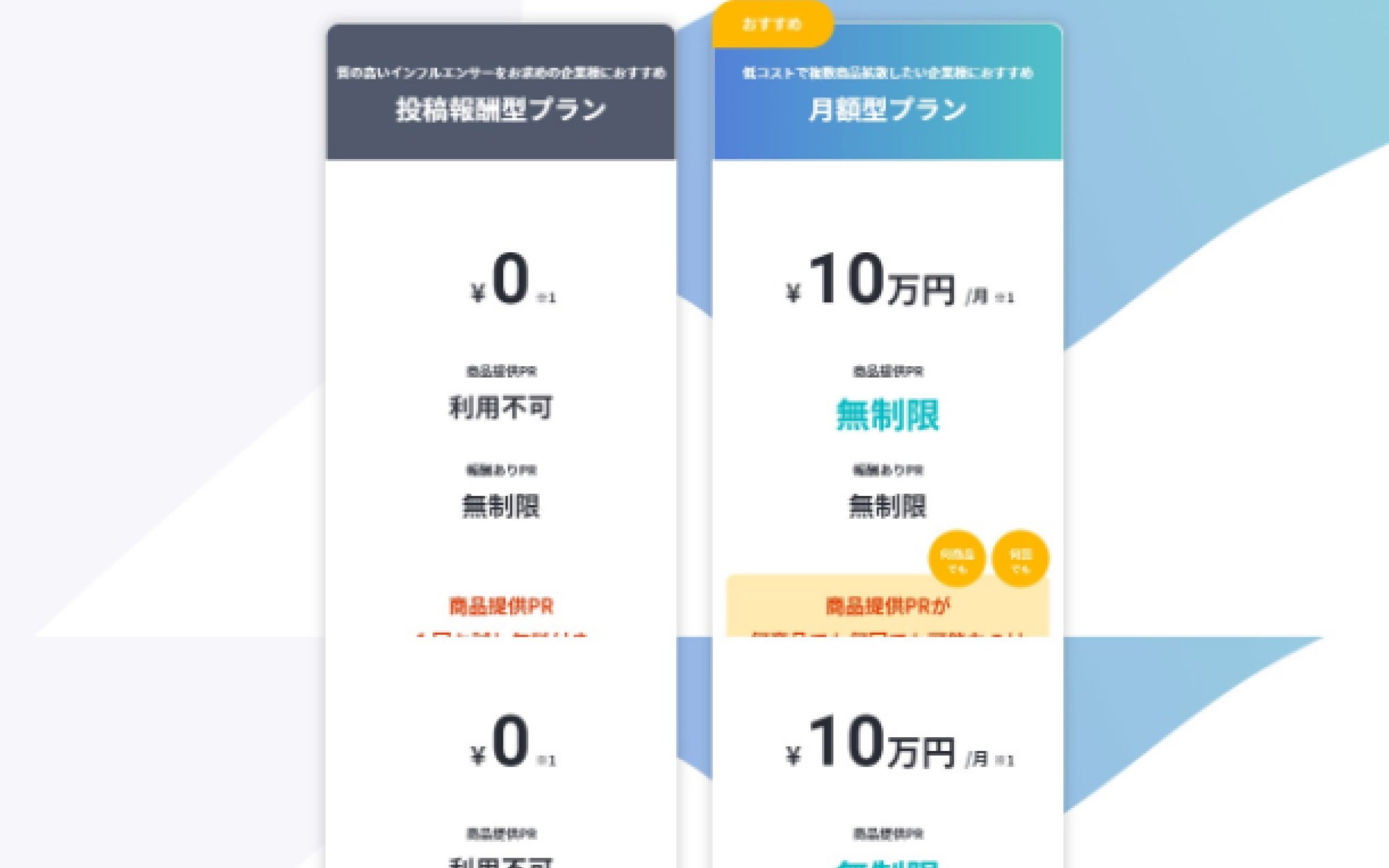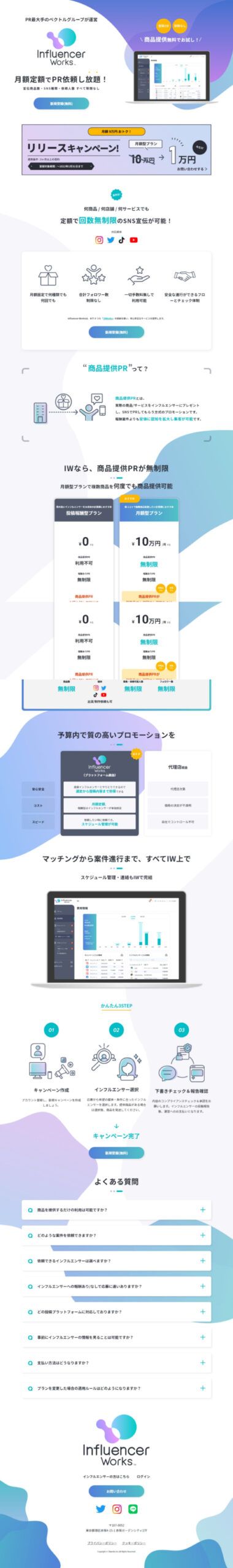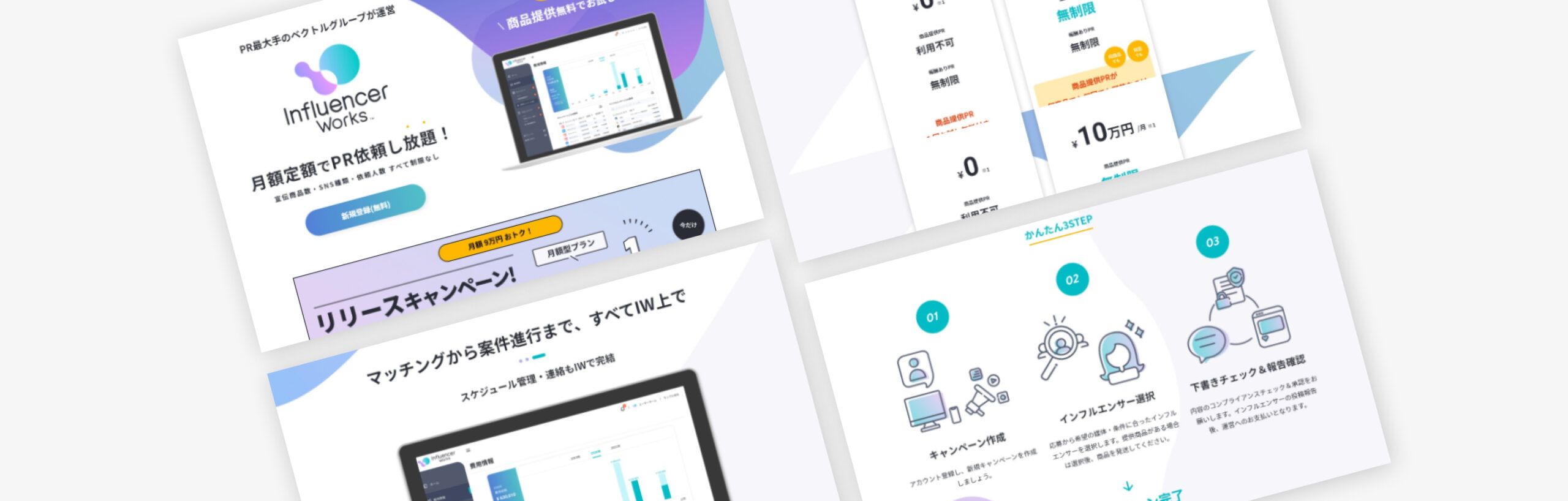 競合となるサービスもあるなかで、「インフルエンサーワークス」の強みは「月額定額でPRを依頼し放題」という点にあり、この点を前面に打ち出して差別化を図りました。また、ターゲットは主に広告代理店やメーカーなどの企業となるため、デザインはインフルエンサー向けLPとの統一感も出しつつ、「わかりやすさ」を重視してBtoBの商材としてしっかりと使用できるような内容に仕上げております。