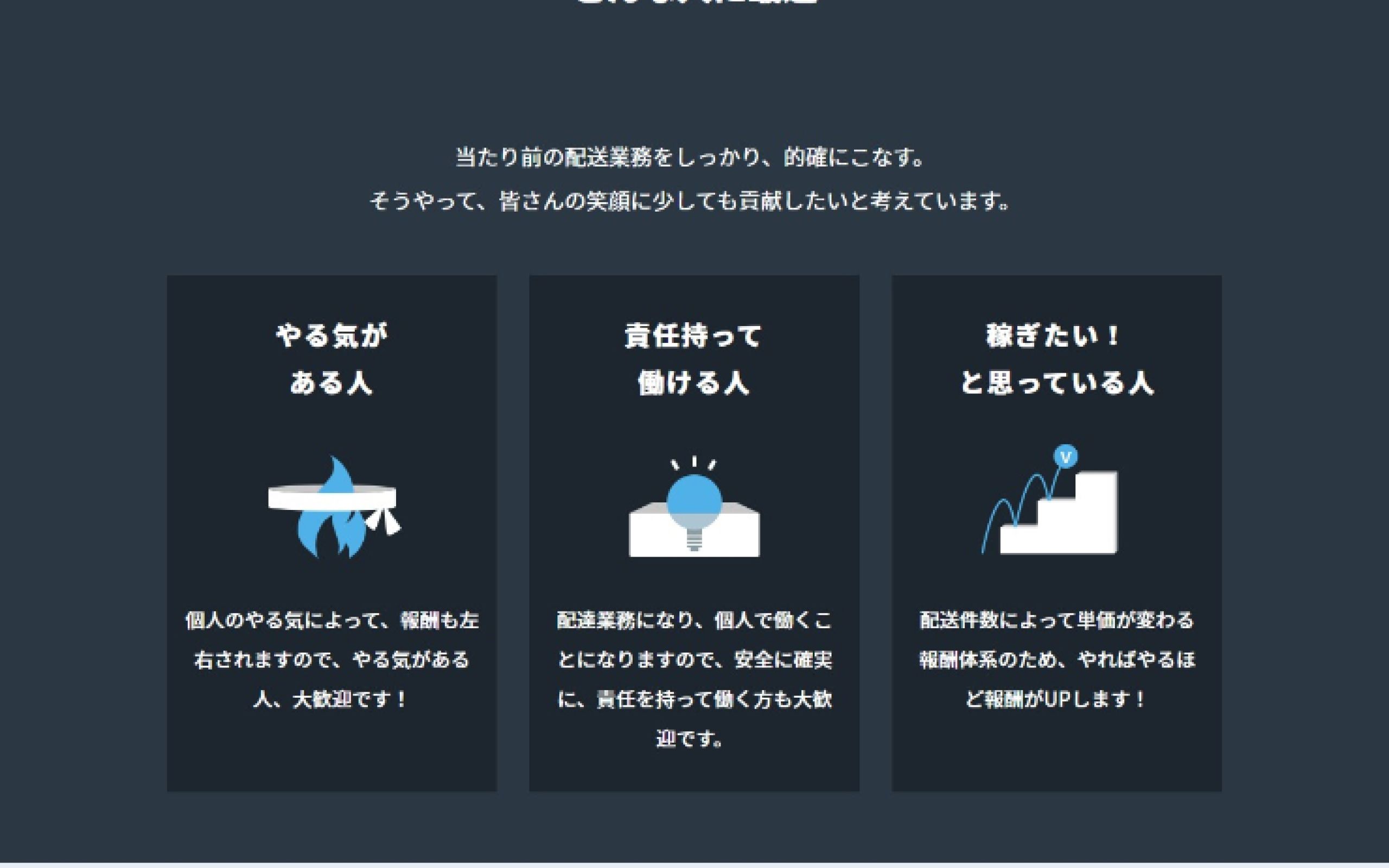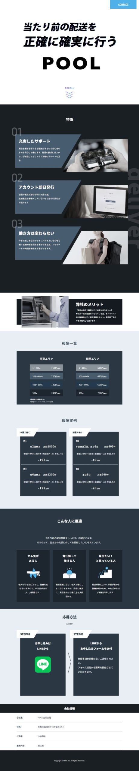 https://pool-delivery.com/バイクデリバリーサービスを提供される「POOL合同会社」様のランディングページ制作の事例です。こちらの会社様は「出前館」の正規代理店としてバイクデリバリーサービスを提供されており、今回ドライバー募集のためのLP制作をご依頼いただきました。「できるだけ早く、かつできる限り予算を抑えたい」というご要望であったため、NERDの新サービス「カクヤスホームページ制作」をご提案させていただき、ご依頼から約3週間でスピーディーにリリースに至りました。