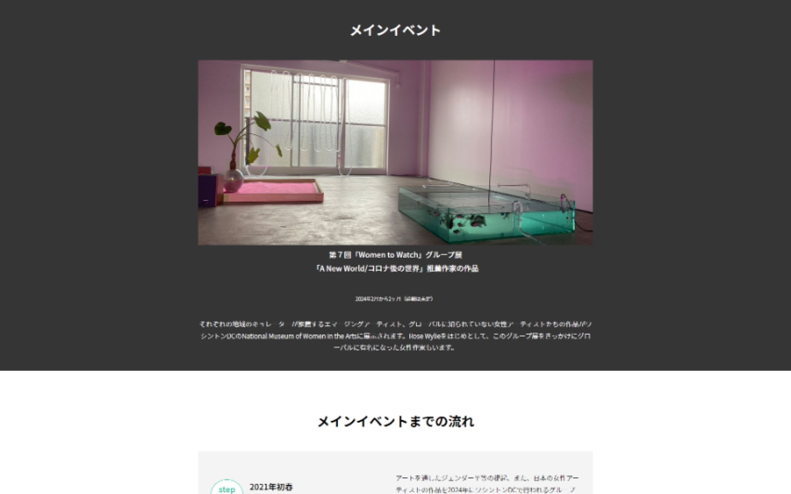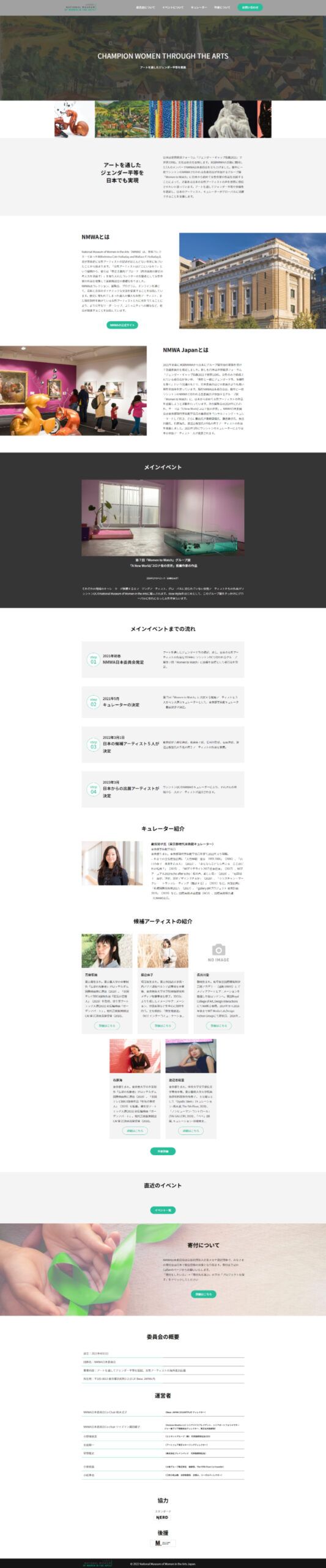 https://nmwa-japan.com/National Museum of Women Arts(NMWA)日本委員会のサイト事例のご紹介です。NMWA Japan(NMWA日本委員会)は、数年に一度ワシントンのNMWAで行われる各委員会が参加するグループ展「Women to Watch」に、日本から初めて女性アーティストの作品を出展しようと活動を行っています。2024年に行われる「Women to Watch」のテーマは「A New World/コロナ後の世界」。NERDがサイト制作協力として参画しています。