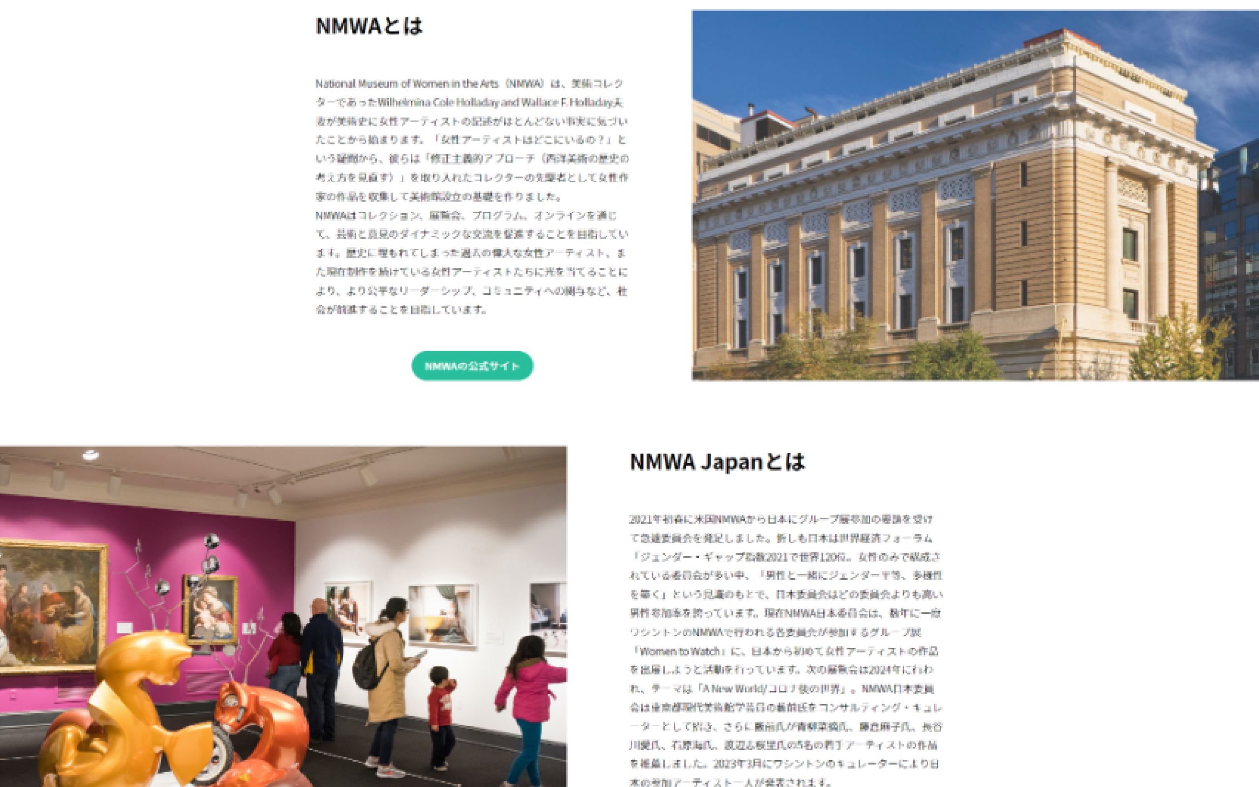 NPO団体である「NMWA Japan(NMWA日本委員会)」がどのような活動をしているかが分かりづらい。またサイトの多言語対応の実装や、問い合わせを受け入れられるようにしたい。