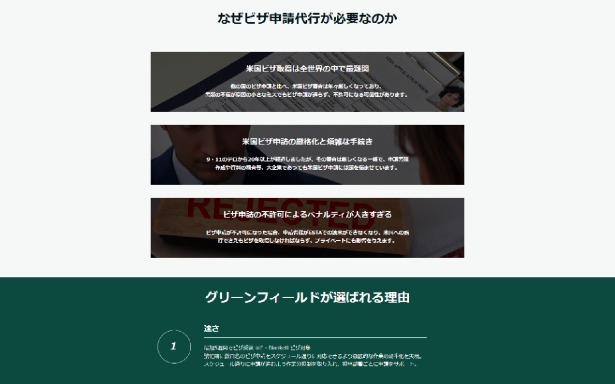 https://landing.green-f.biz/「株式会社グリーンフィールド・オーバーシーズ・アシスタンス」は、企業の米国ビザ申請代行のトータルサポートを行っている会社です。米国ビザの取得は厳格化が進んでおり、一度取得に失敗すると再申請の手続きに手間と時間がかかることから、企業としては、米国ビザの取得失敗はリスクとなります。クライアント様は複数の大企業をはじめとした、多くの企業の米国ビザ取得代行を請け負っています。この度、広告用のランディングページの制作にあたり、NERDにご依頼をいただきました。