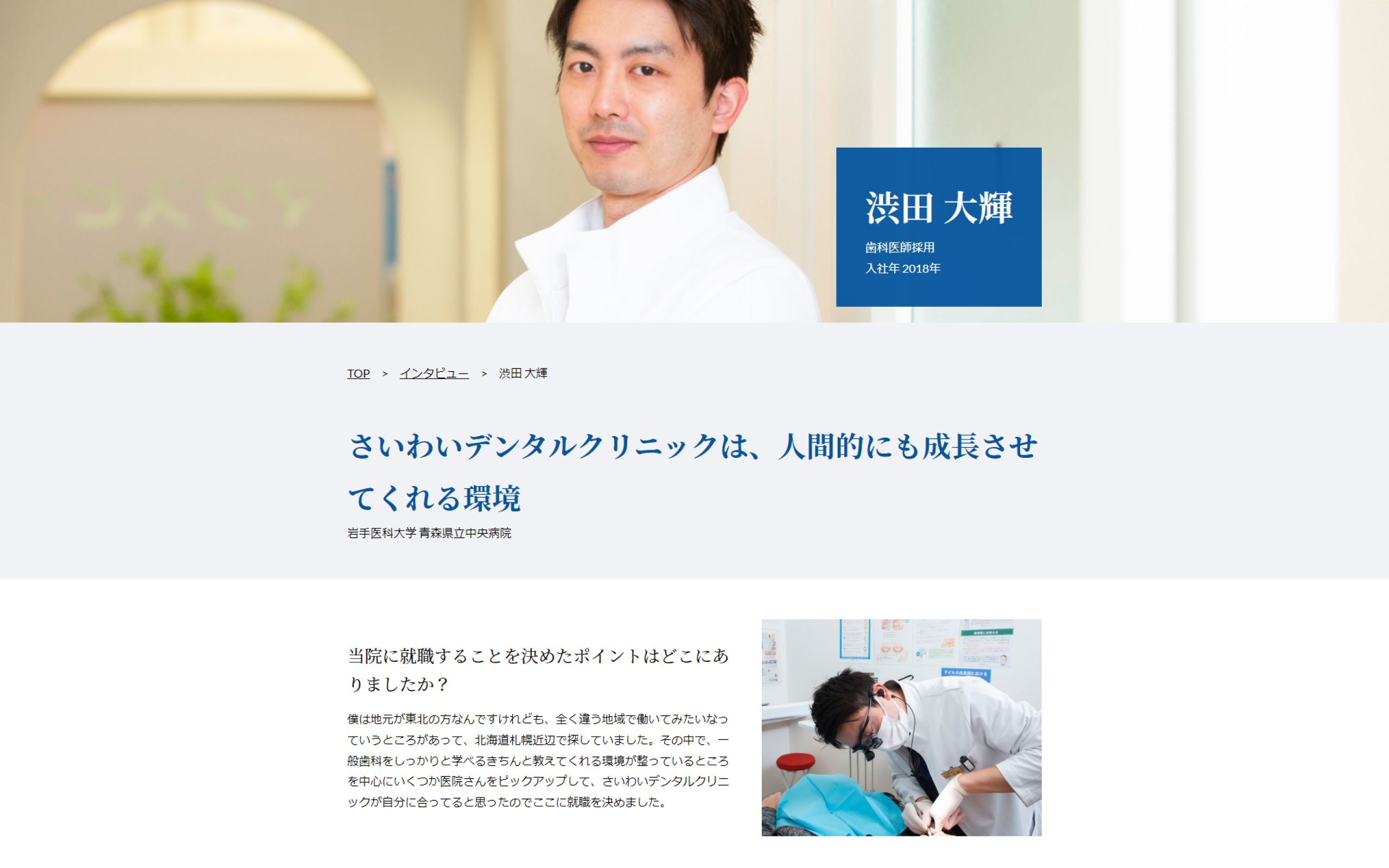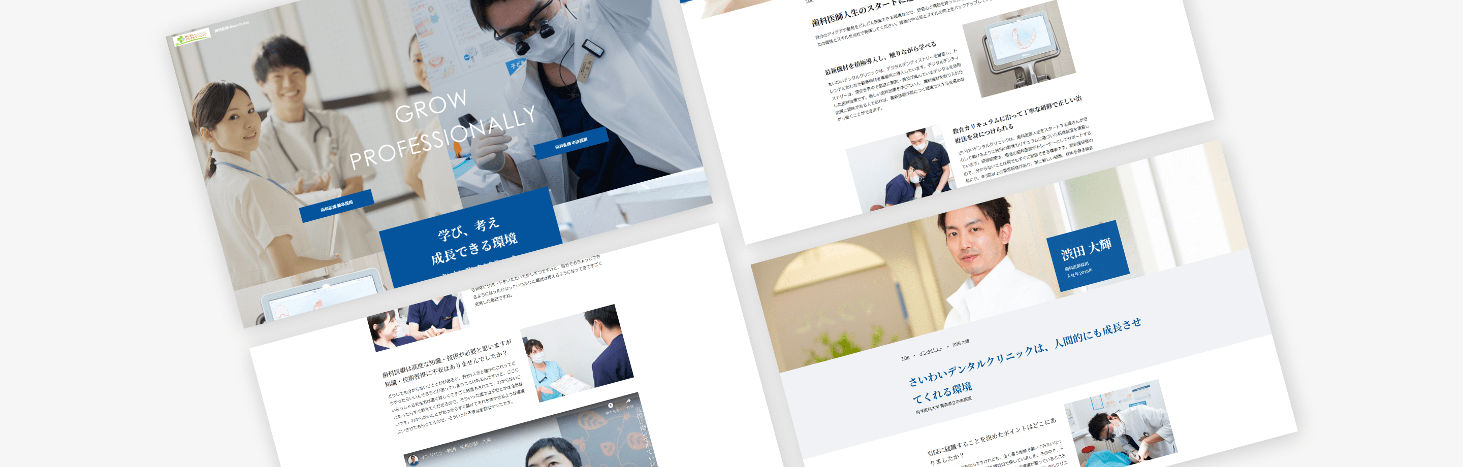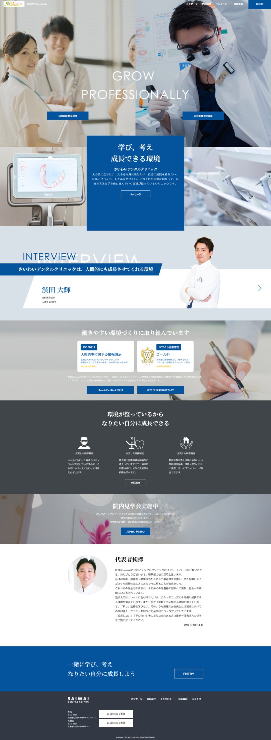 「さいわいデンタルクリニック」は一般の歯科保険診療に加え、ホワイトニング・自費クリーニング等のサービスを提供しています。PR活動に積極的で、これまでもweb広告運用やローカルCMの制作等、様々なチャレンジをされていて、ありがたいことにWeb広告やWebサイト制作は2年以上継続して当社にお任せいただいています。 現在は、北海道北広島市内に2医院展開しており、次世代の育成にも力を入れられています。店舗・事業拡大にあたり、人材を採用していくため採用サイトを作りたい、とNERDに制作のご依頼をいただきました。