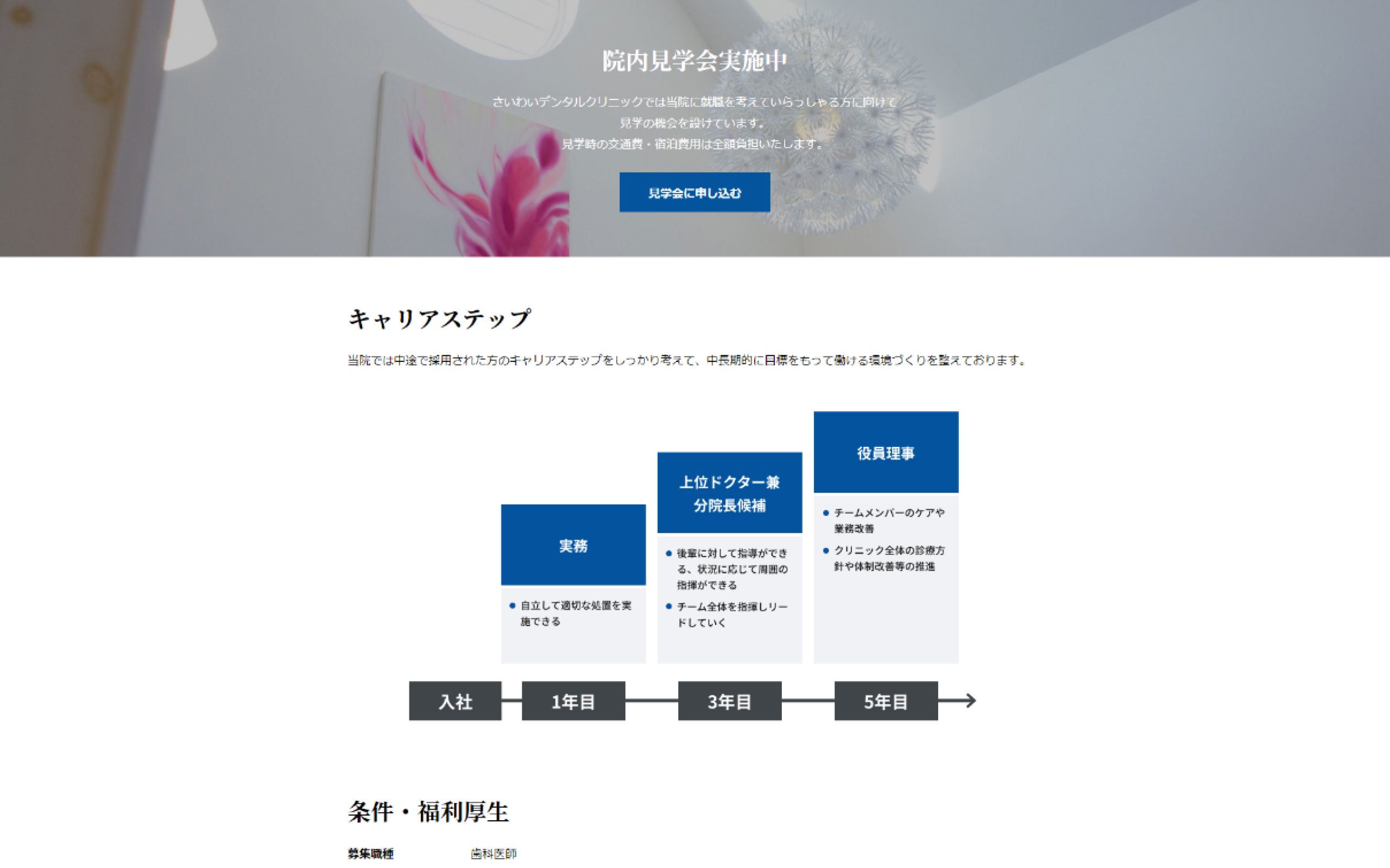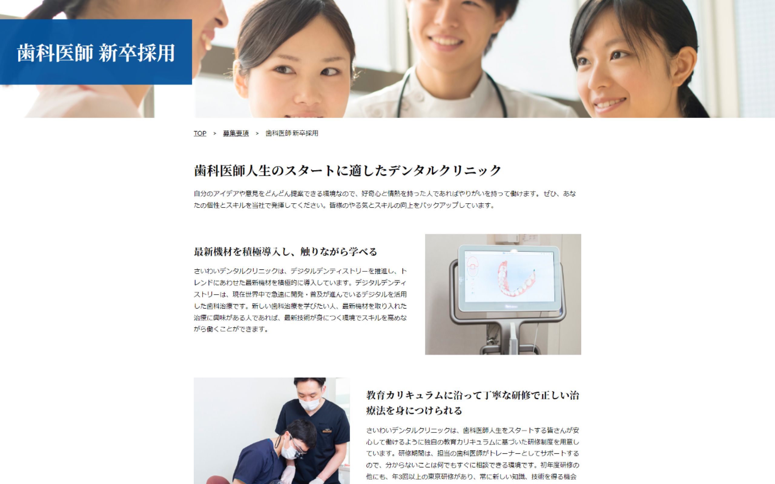 また歯科医師の「新卒」枠と「中途」枠のどちらも積極的に採用していきたいと考えられていましたが、ターゲットが異なるため、採用サイトでどのように掲載したら良いか分からない、という悩みを抱えられていました。