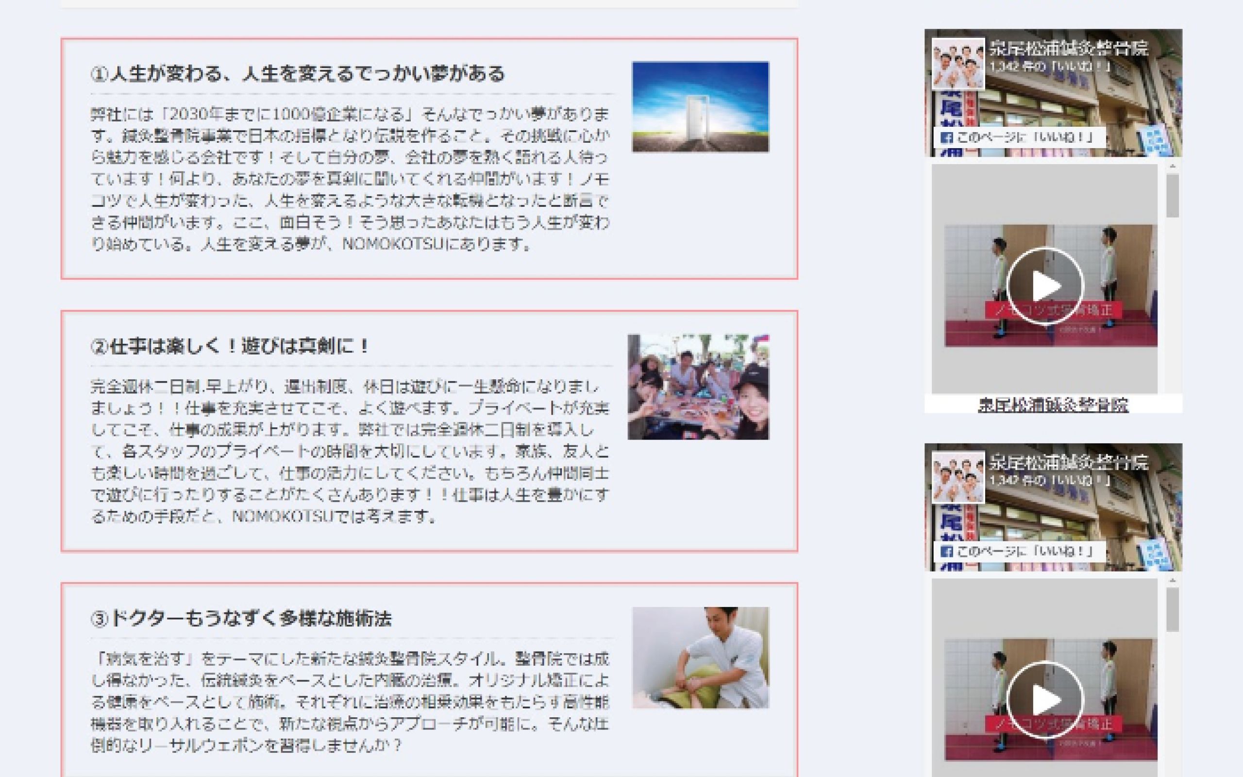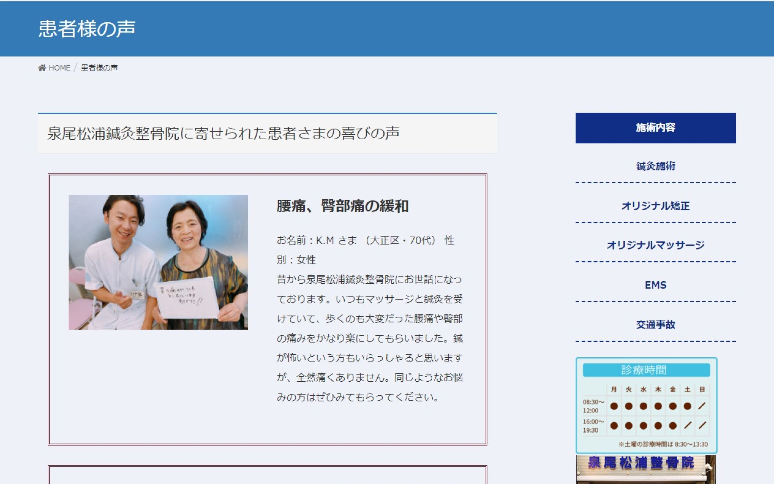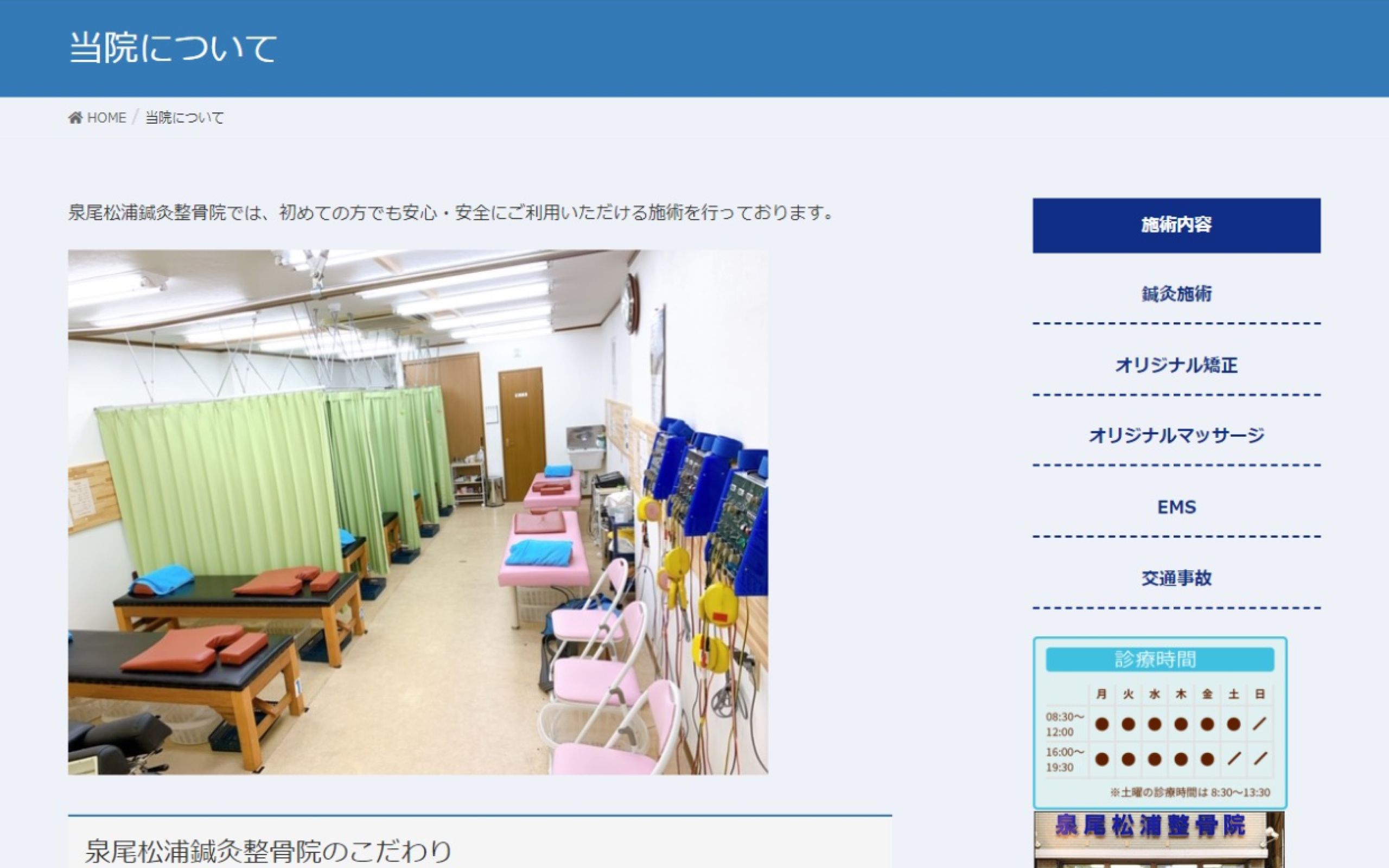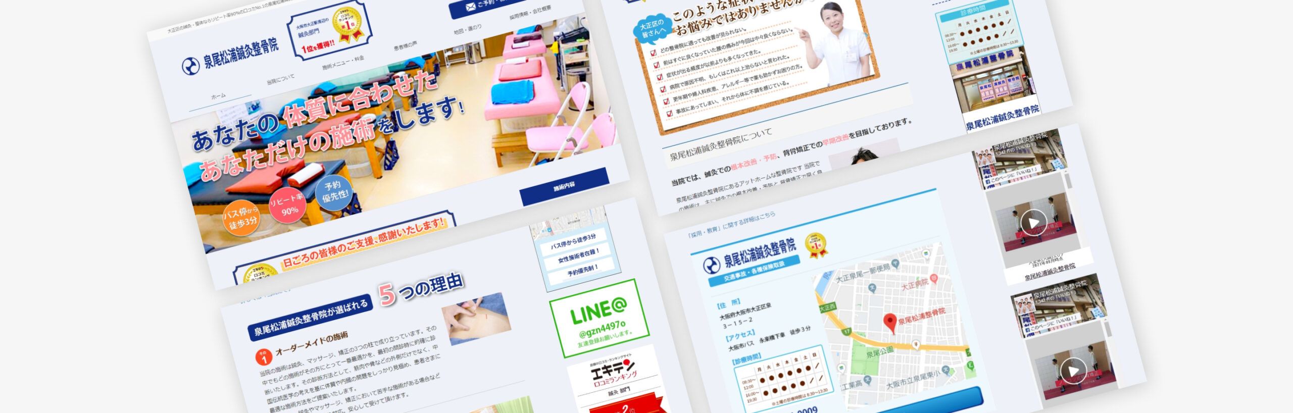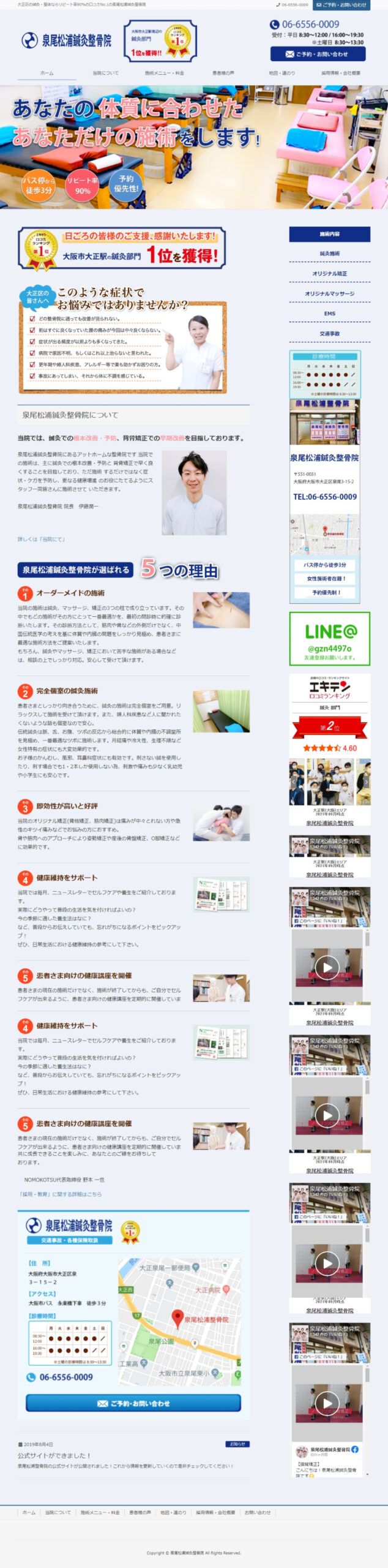 https://izuo-nomokotsu.com/大阪で鍼灸施術を提供されている「泉尾松浦鍼灸整骨院」様の店舗ホームページ制作の事例です。こちらの整骨院では伝統的な鍼灸を取り入れ、患者1人1人の体質に合わせた鍼灸施術をされていらっしゃいます。今後を見据えてWebでのご集客を目的とした自社サイトが欲しいとのお話しをいただき、制作をご依頼をいただきました。予算が限られているなかで必要とされている内容をクリアすべく、可能な限りのデザインや実装をご提案させていただきました。今後とも集客にご活用いただければ幸いです。