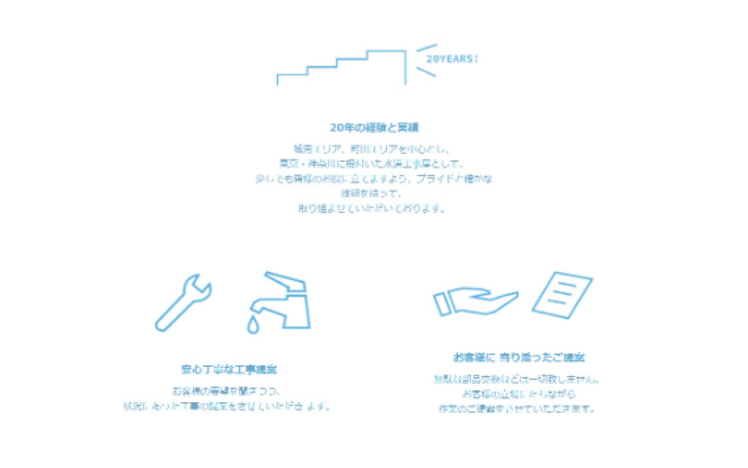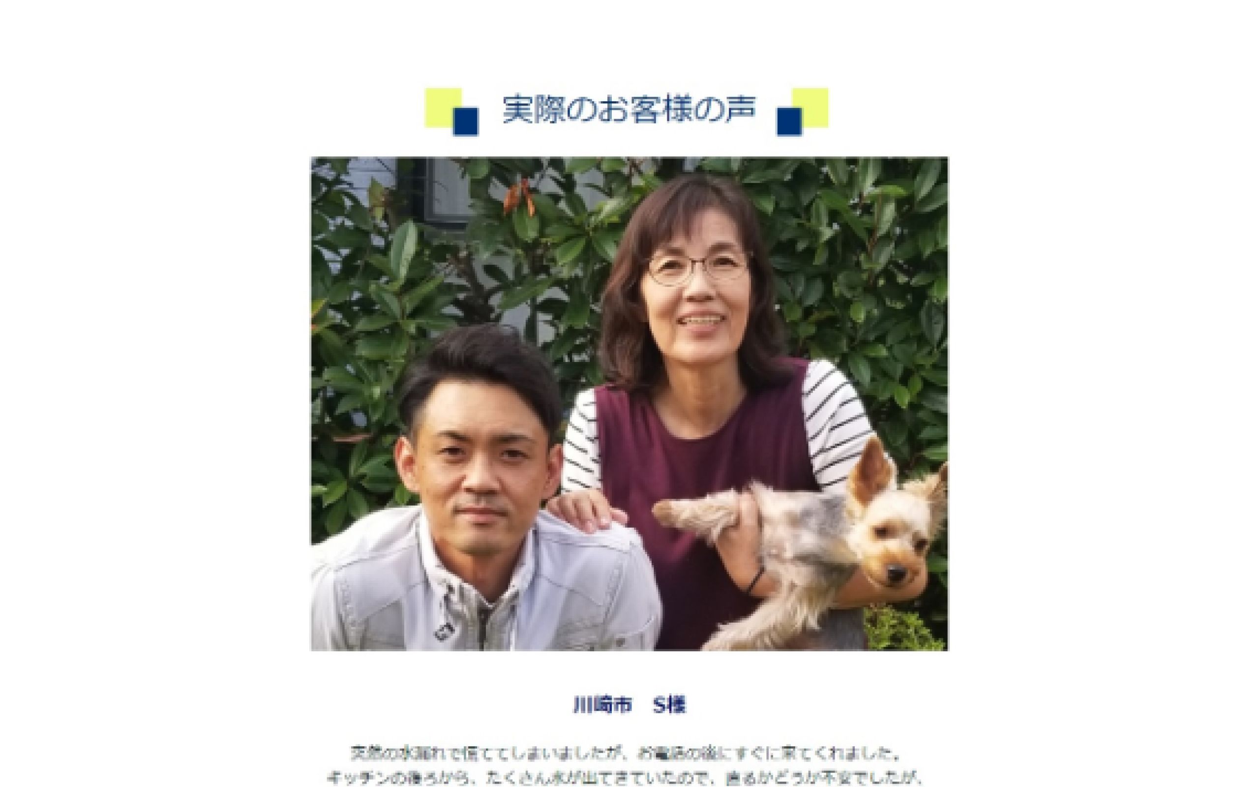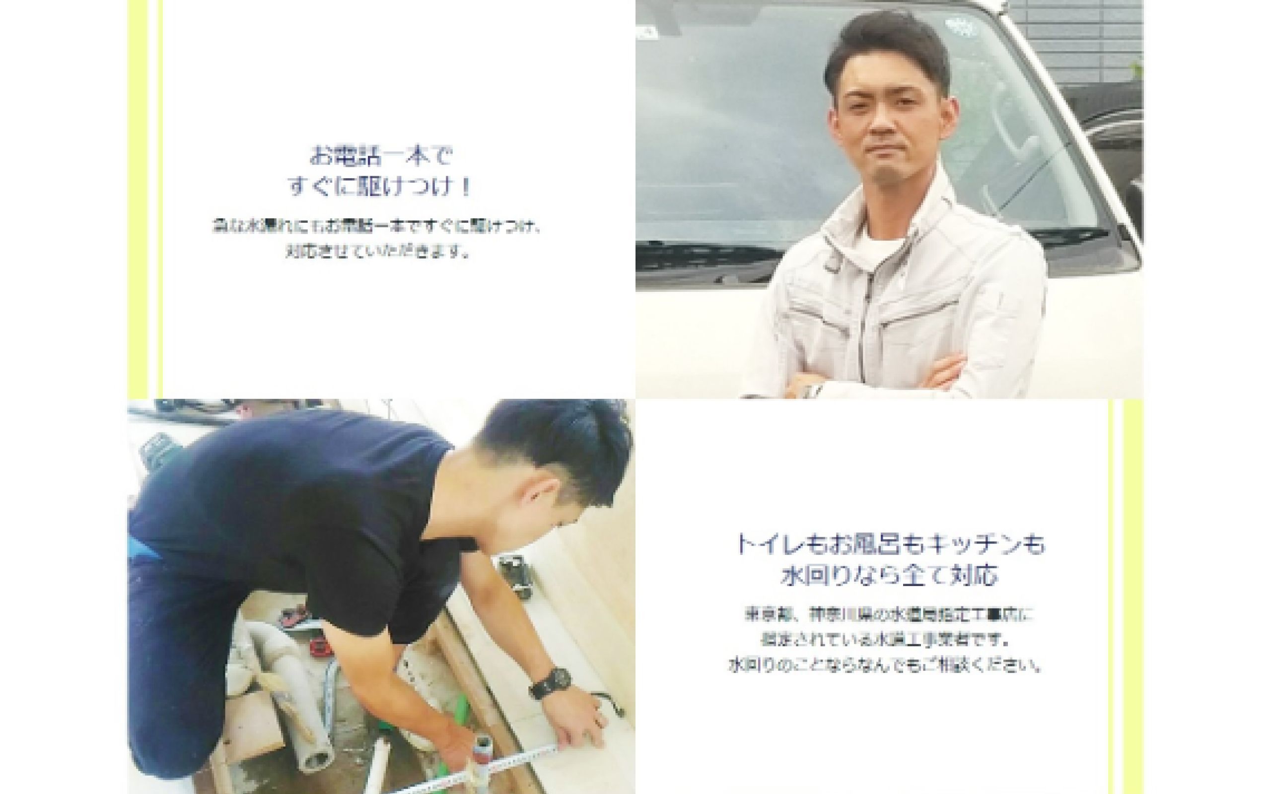 レイアウトやデザイン、記載内容は全てお任せいただきました。実際の社員さんの顔を出しつつ、迅速な対応の水道業者であることと共に、安心・信頼を得られる構成、デザインと致しました。