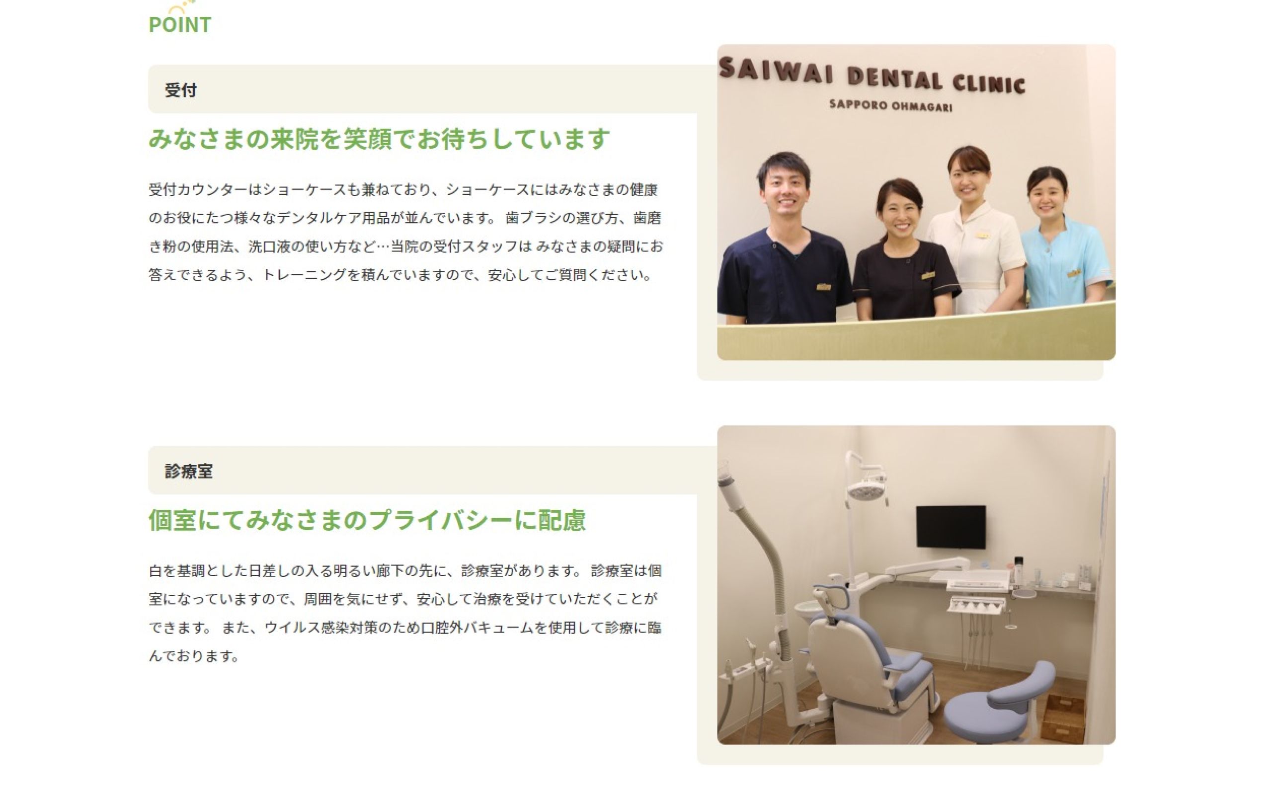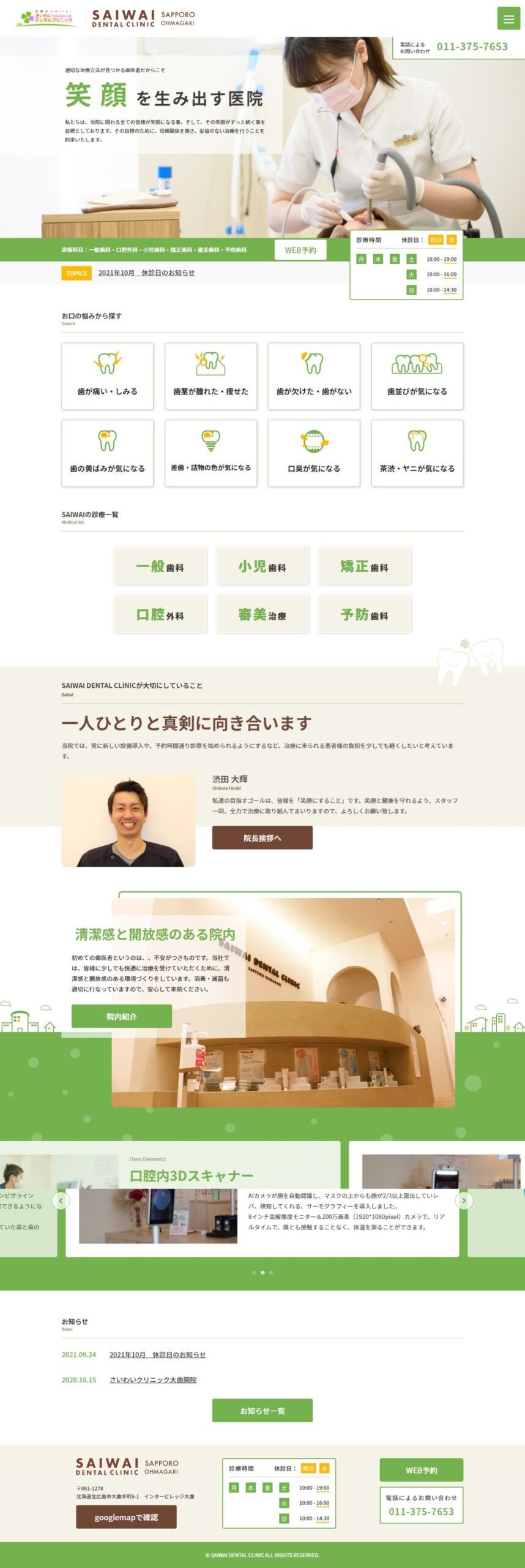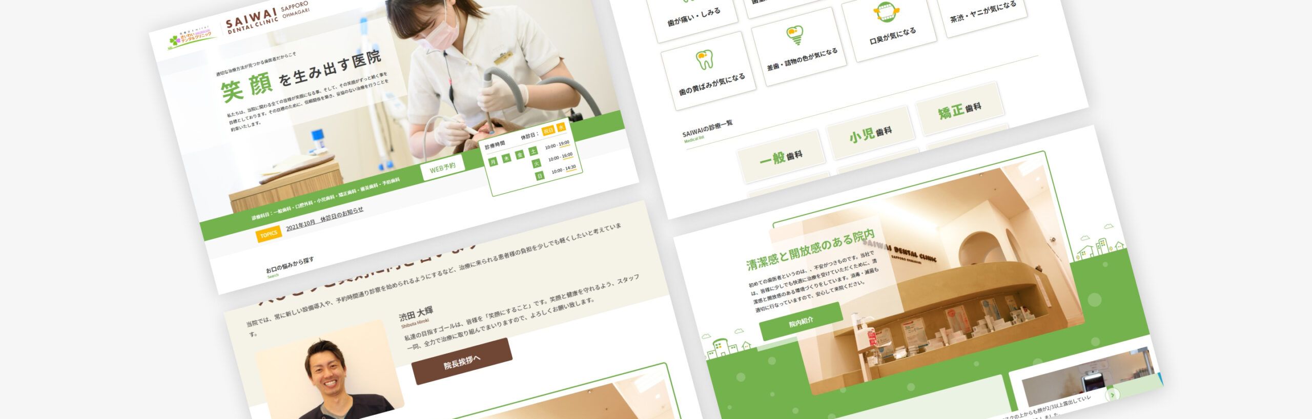 https://ohmagari.saiwaidental.jp/北海道に拠点を構える「さいわいデンタルクリニック大曲」様の店舗ホームページ制作の事例です。北広島市にある「さいわいデンタルクリニック」様が近隣商業施設に新たに分院を開業されることとなり、新しい医院のホームページ制作をご依頼いただきました。虫歯やホワイトニングなど歯の悩みに広くお応えできる医院ということが伝わるような導線を設計させていただき、全体的に落ち着きのあるデザインに仕上げました。予約増加にもつながっているというお声を頂戴しております。