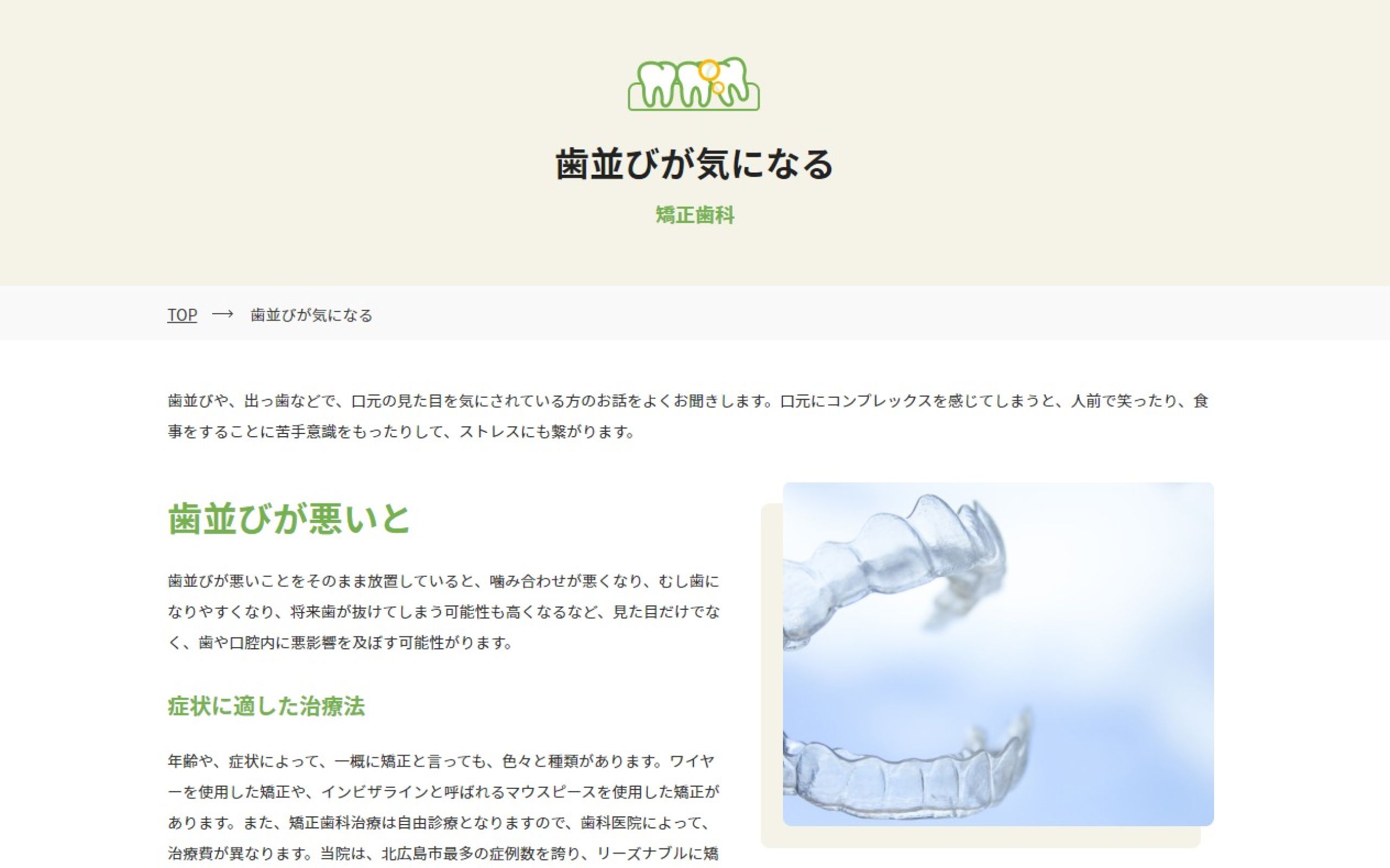 北海道北広島市にある歯科クリニック様が、新たに近隣の商業施設へ分院を開業することとなり、新しい医院のホームページ制作をNERDへお任せいただきました。基本となる虫歯の治療だけでなく、ホワイトニングやマウスピース矯正、前歯の矯正など自由診療に強く、様々な歯の悩みを相談できる医院であるという点を周知させたいとご要望をいただきました。